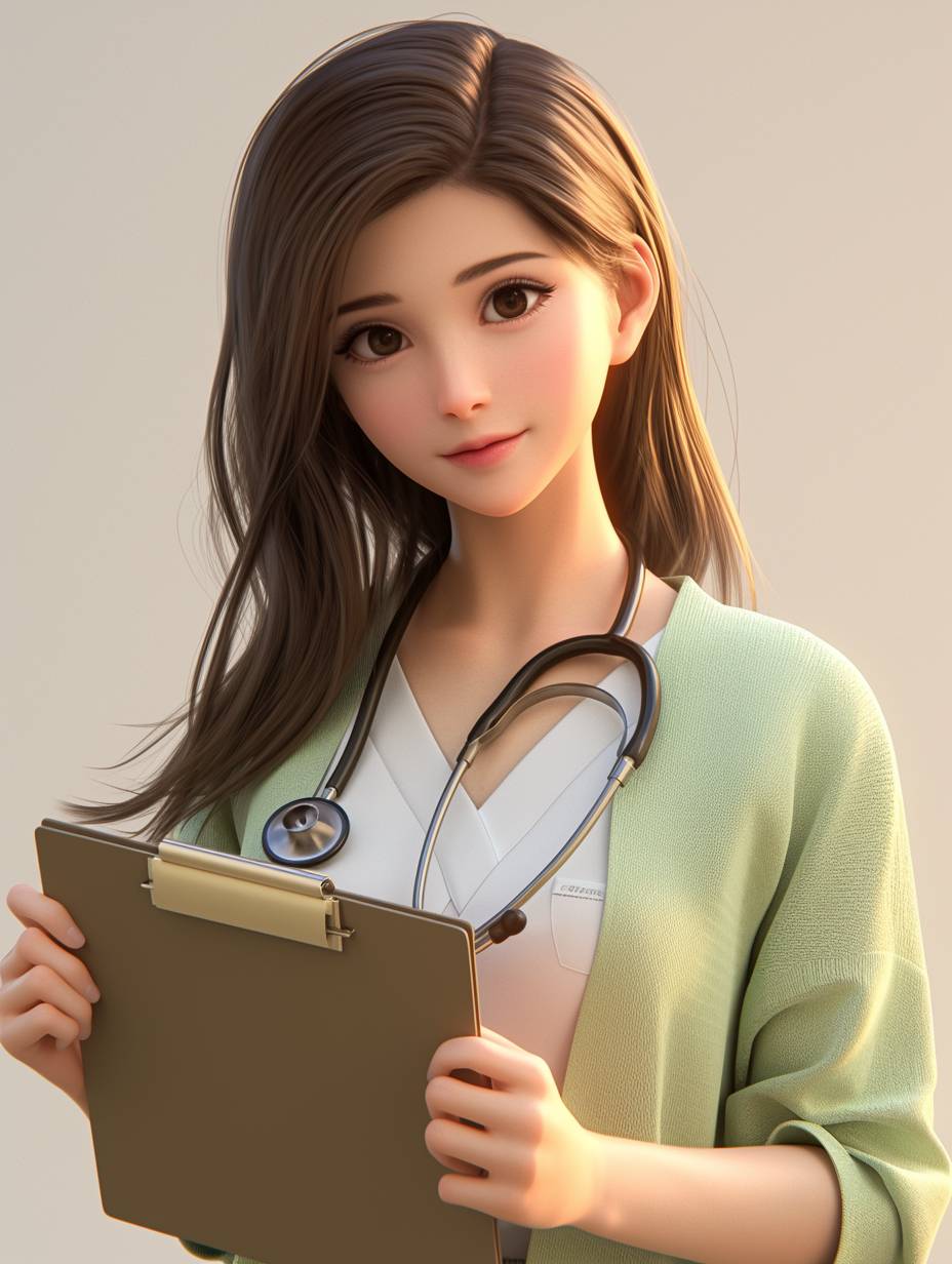 A thirty year old woman holding the physical examination board, Wearing Green knitted cardigan, with long Long straight hair, Female white-collar worker, with a UI style, in the style of soft and rounded forms, Macaron color system, youthful protagonists, magewave, website, bryce 3d, cute cartoonish designs, Simple background, Clay style, C4D --ar 3:4 --niji 6
