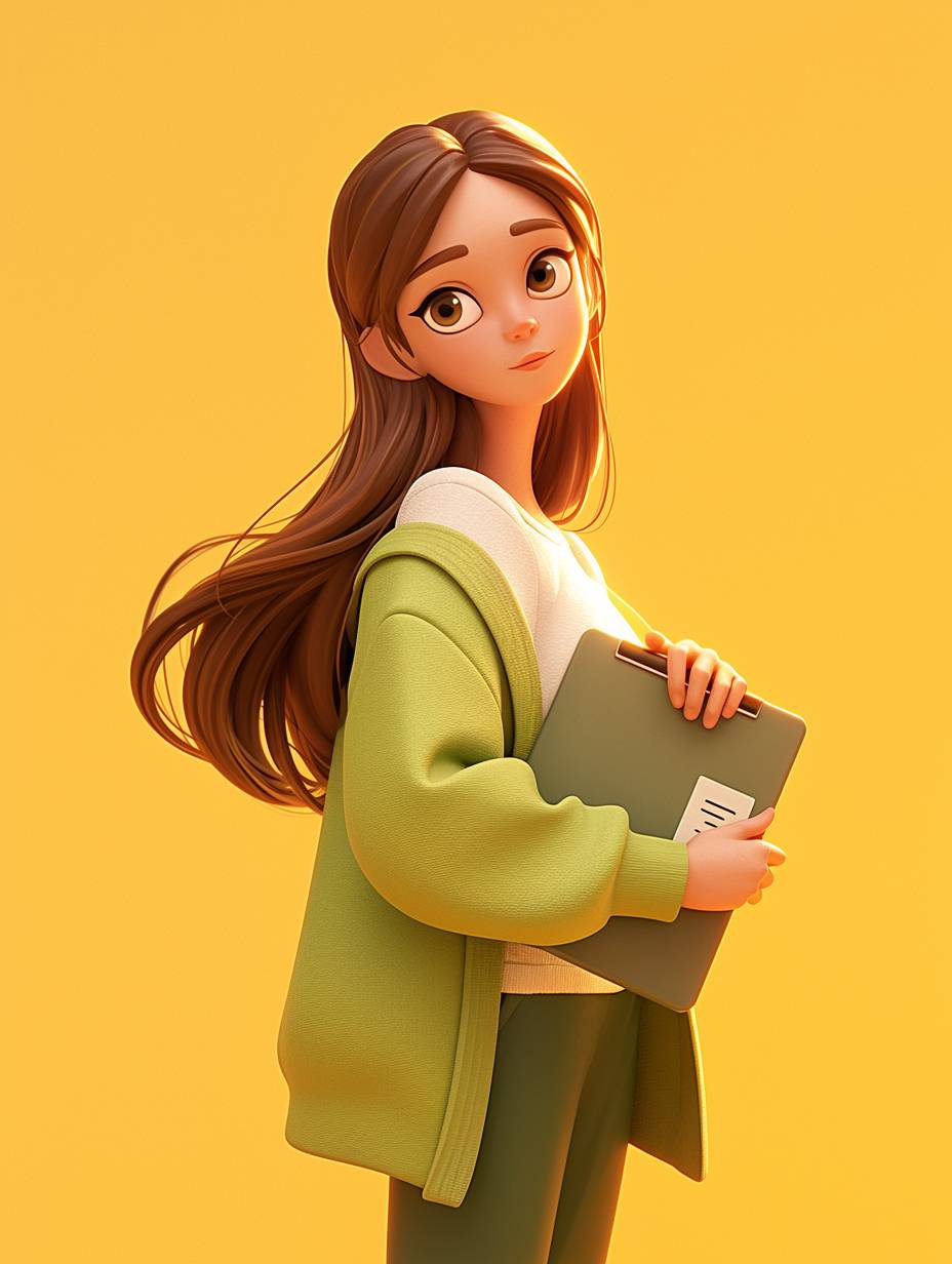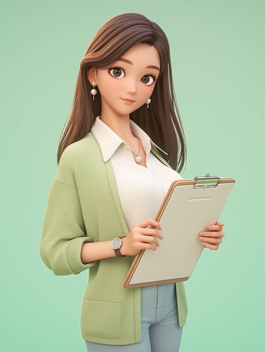 Une femme de trente ans tenant le tableau d'examen physique, portant un cardigan en tricot vert, avec de longs cheveux raides, travailleuse de bureau, dans un style UI, avec des formes douces et arrondies, un schéma de couleurs macaron, des protagonistes jeunes, magewave, site web, Bryce 3D, designs de dessins animés mignons, fond simple, style argile, C4D.