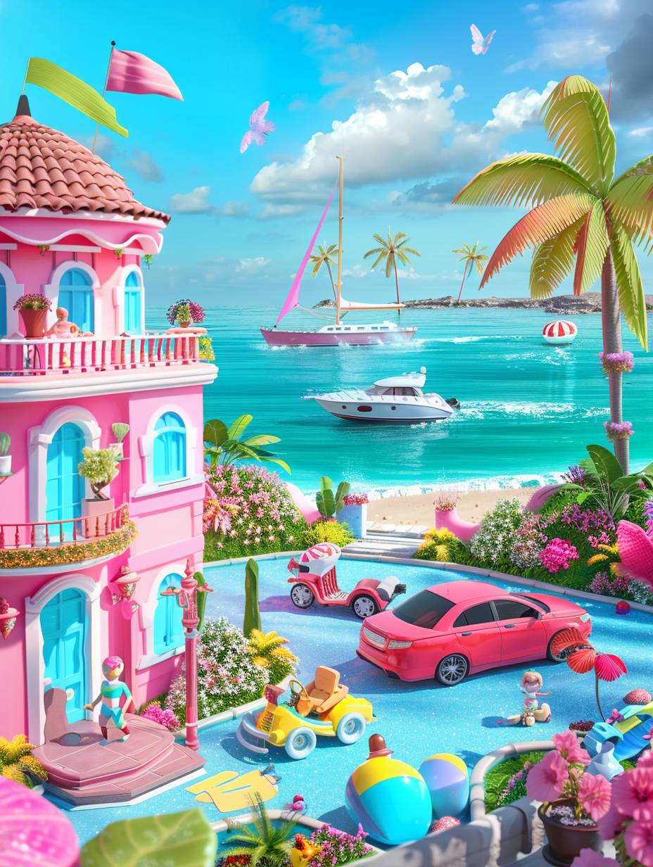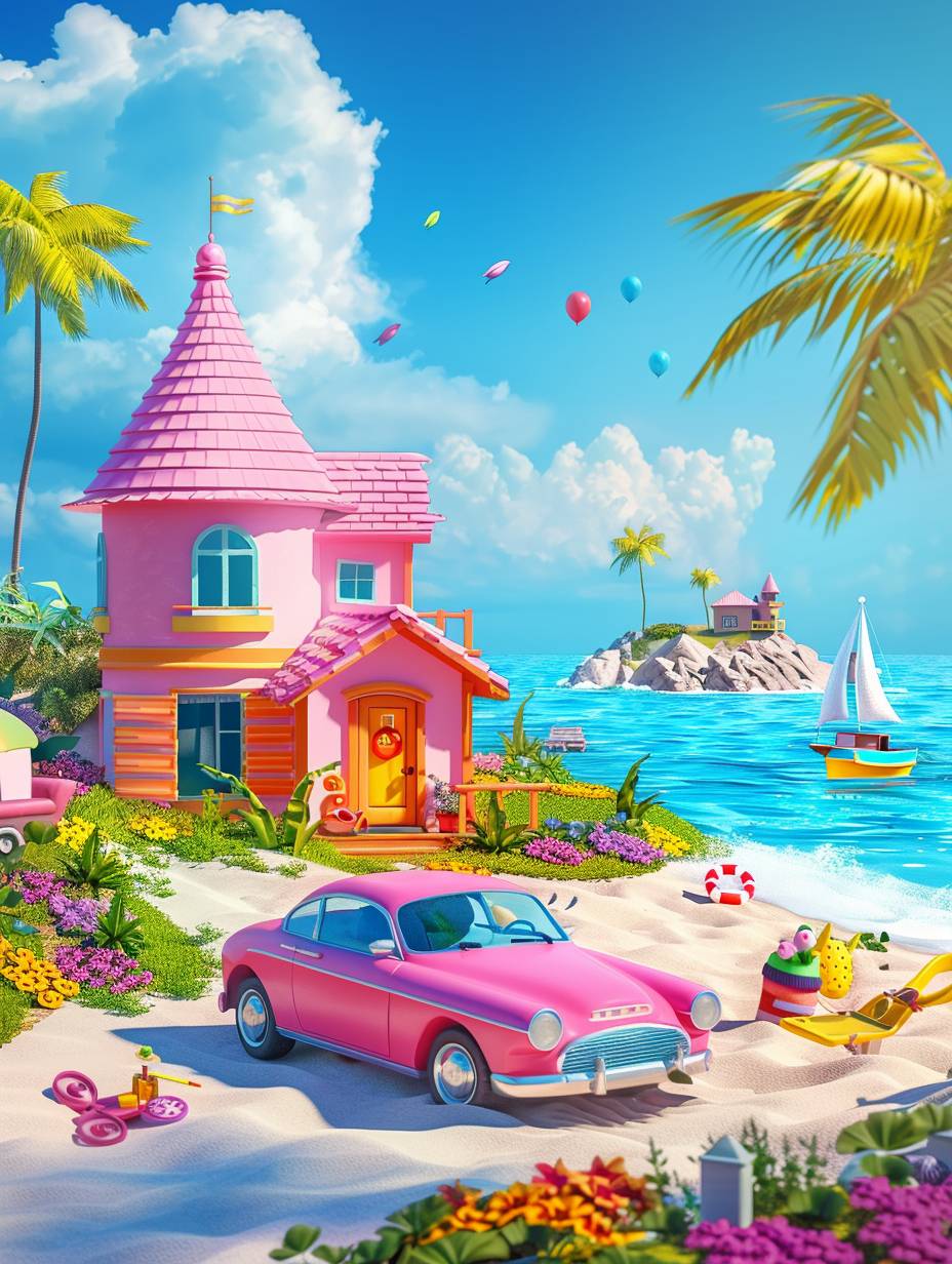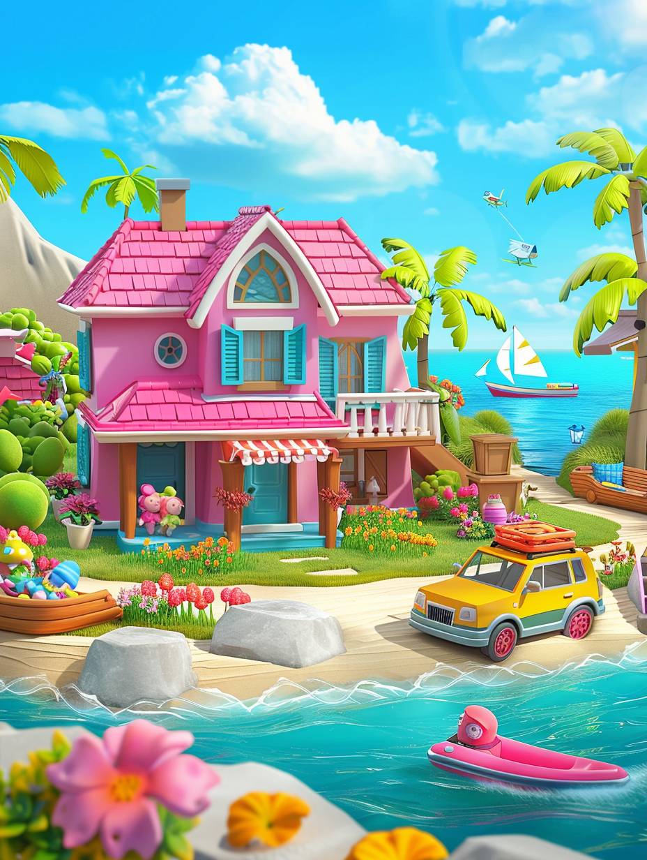 Game design, UI interface, cartoon style game scene with yacht and car on the beach in front of villa house, there is an island next to it full of toys and dolls, pink walls and roof, blue sky, colorful flowers around the yard, boat floating at sea behind, Pixar mobile games, cartoon style, bright colors, 3D rendering, high resolution, high detail, high quality, in the style of Pixar. --ar 3:4 --stylize 50 --v 6.0