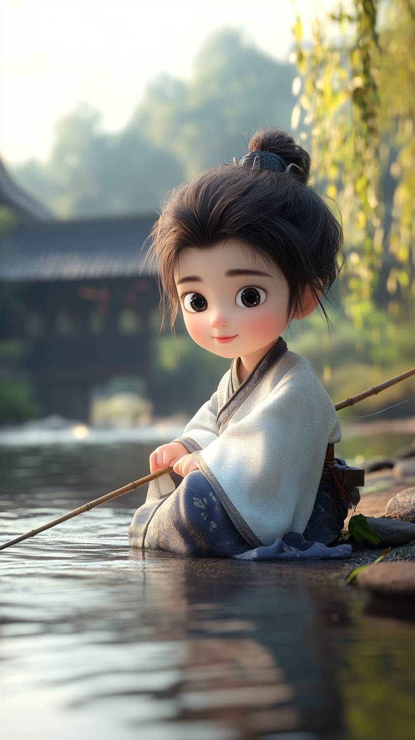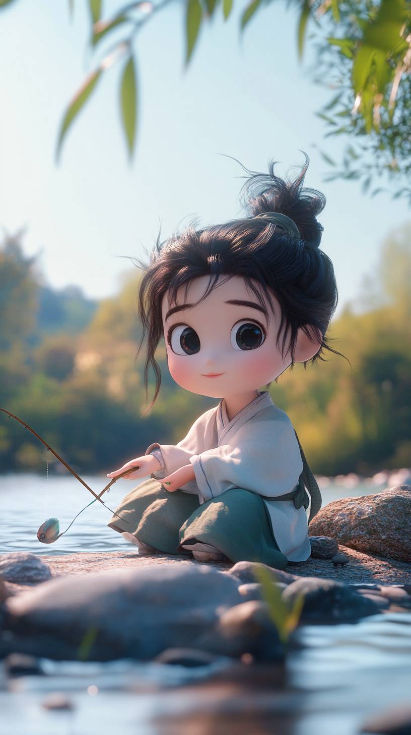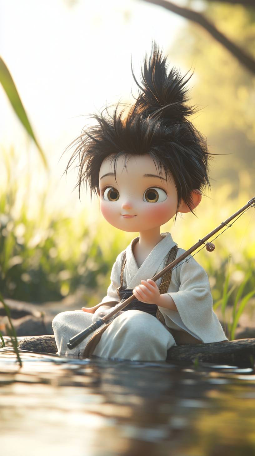 A cute Chinese little boy with messy hair sat by the river learning to fish, wearing traditional ancient Chinese clothing, in Pixar style, calm water surface, gentle sunlight, tranquil countryside atmosphere, 3D cartoon, amazing details, rich and colorful, highly detailed, clear focus, high resolution, 8K, 3D rendering. --ar 9:16 --v 6.1