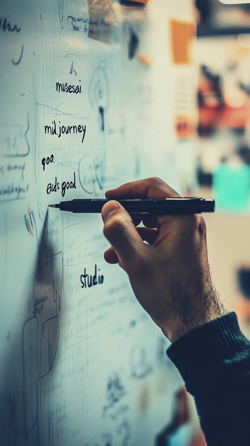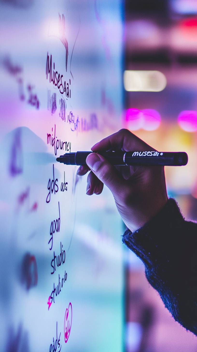 une main avec un marqueur noir, écrivant sur un tableau blanc avec des notes, fond flou lumineux, texte photoréaliste écrit au marqueur 'musesai' et 'midjourney' et 'good' et 'ads studio', 32k