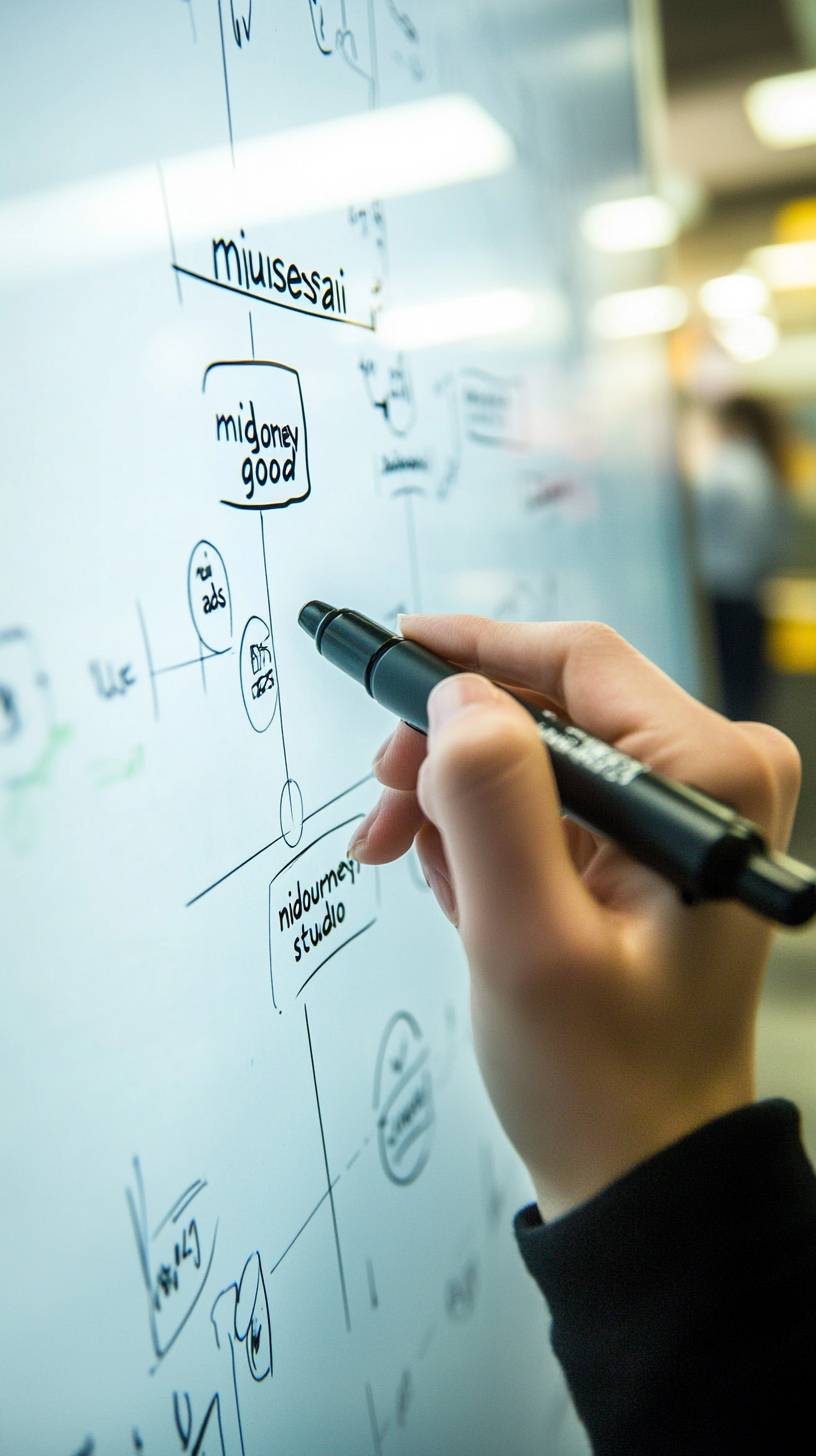 a hand with black marker, writting on white board with notes, blured light background photorealistic writte text in marker "musesai" and "midjourney" and "good " and "ads studio", 32k --ar 9:16 --style raw --v 6.1