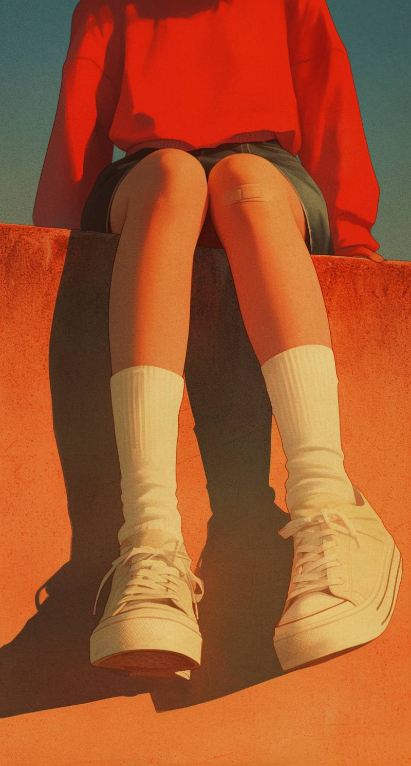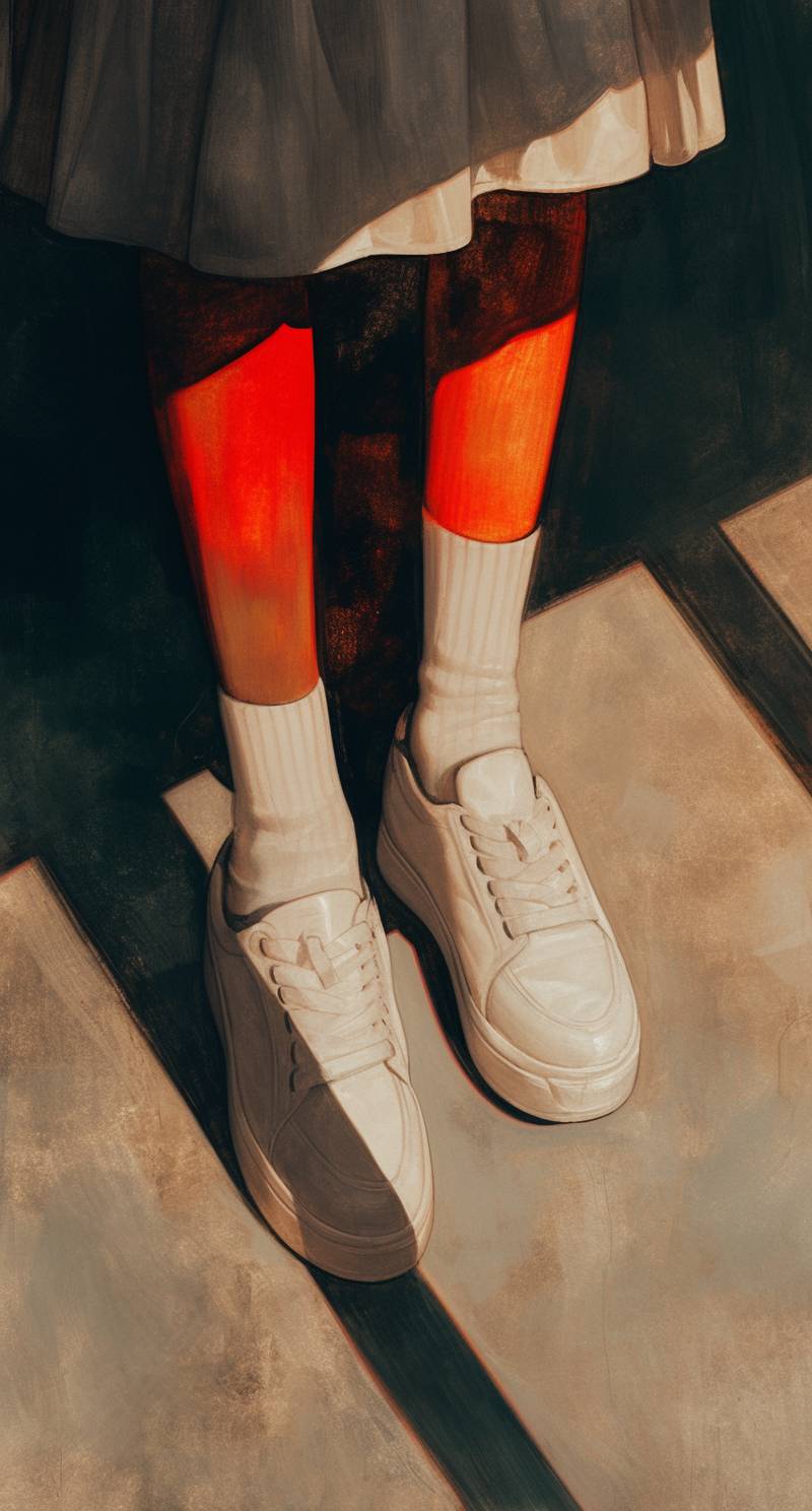 Close-up of a woman's legs, wearing white high-top sneakers. One leg has black and red paint on the knee, resembling a still from a 1990s movie. --ar 69:128 --stylize 400 --niji 6