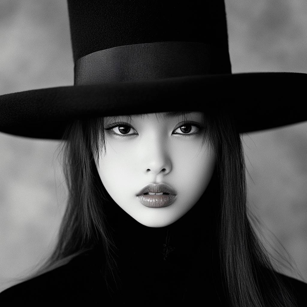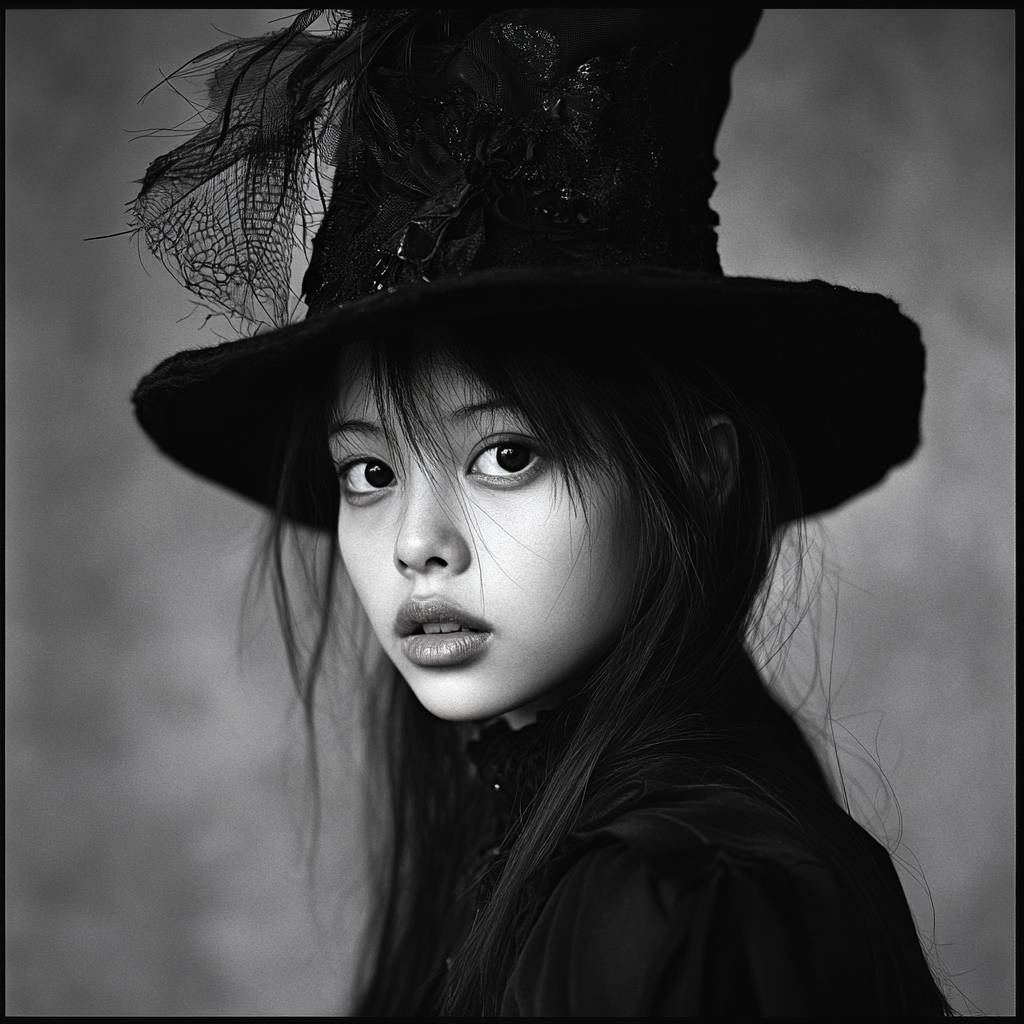 Photograph by Hasselblad camera,A beautiful and energetic Chinese girl wearing pure black Magic hat with no other elements or details on the hat --ar 1:1 --v 6.1