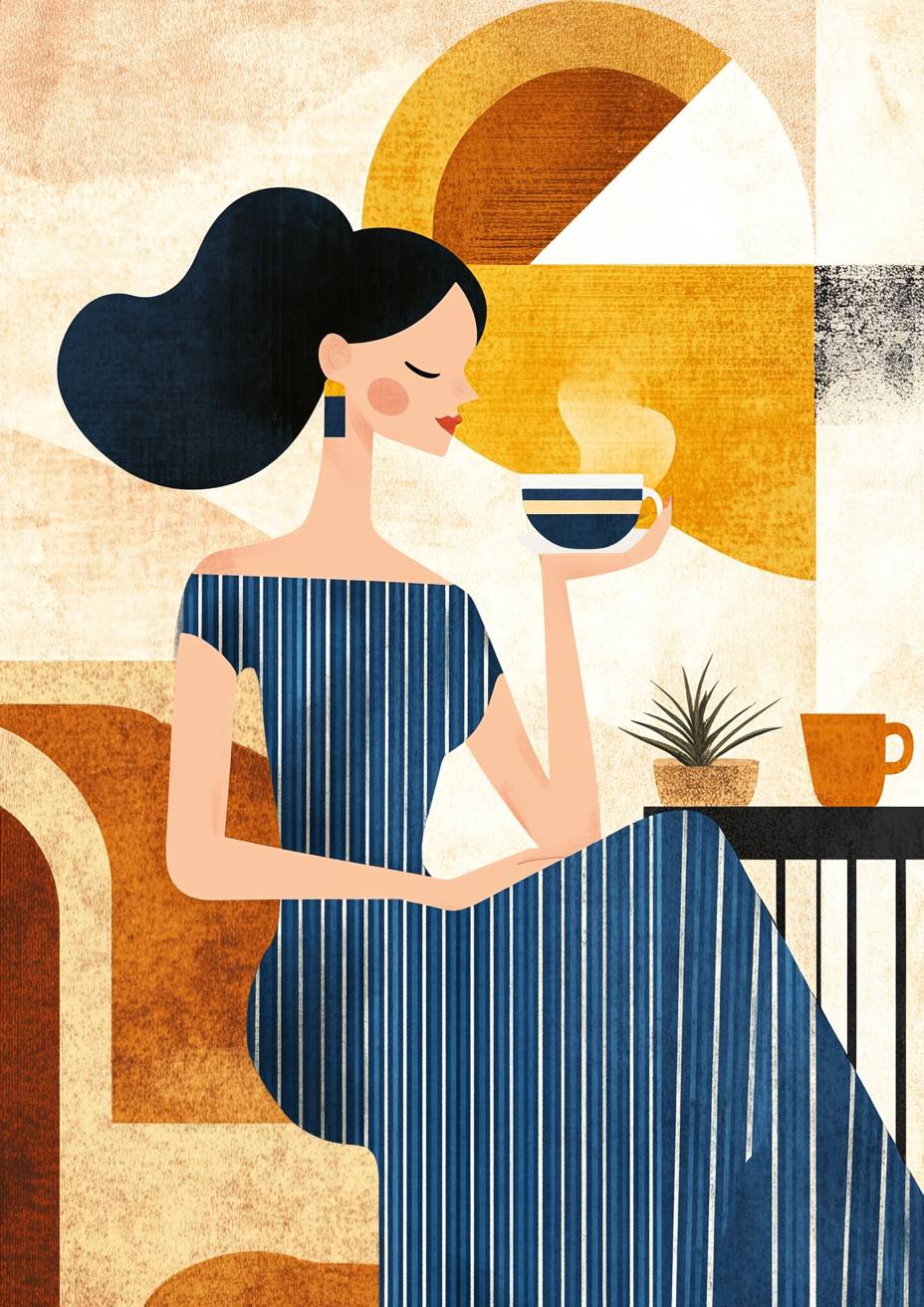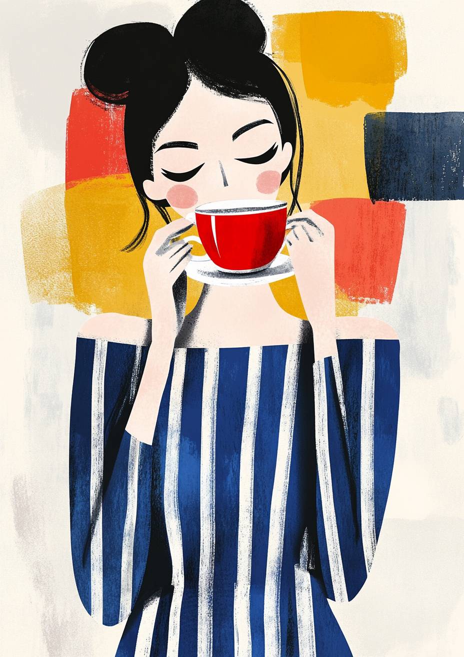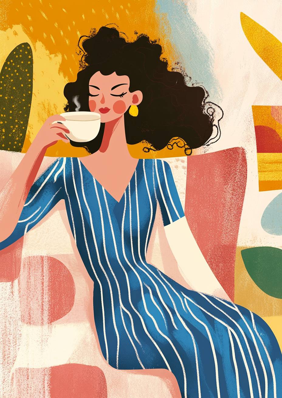 A fashion illustration of a woman in a blue striped dress enjoying hot tea, in the style of Henri Matisse. The illustration has a hand-drawn texture and is presented as an art print. parisian inspired. --ar 91:128 --personalize 5hncg1n --stylize 50 --v 6.1