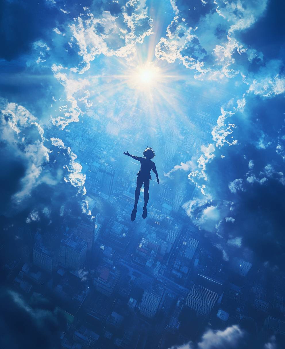 Une personne flottant dans le ciel, entourée de nuages et avec un paysage urbain en dessous, un ciel bleu avec la lumière du soleil perçant, dans le style de l'anime.