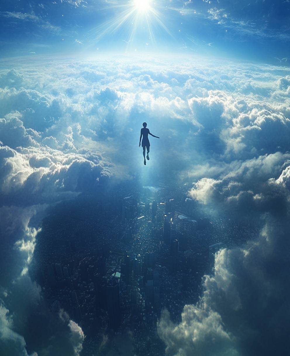 Une personne flottant dans le ciel, entourée de nuages et d'un paysage urbain.