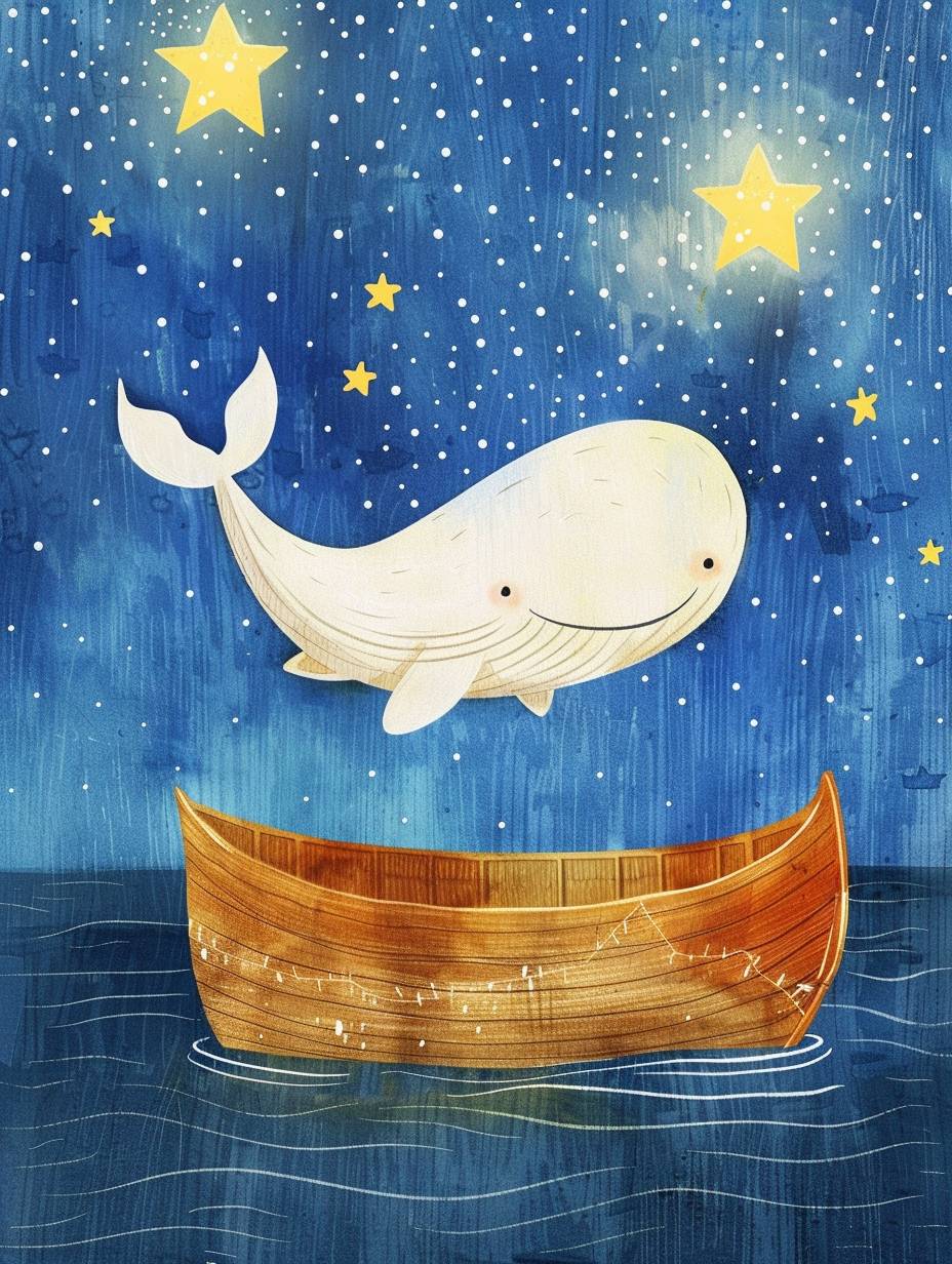 Un petit bateau en bois flotte dans le ciel étoilé, et une adorable petite baleine blanche vole au-dessus du bateau. L'image a un style de dessin d'enfant, avec des lignes simples et une texture de crayon. Elle présente un fond bleu avec des étoiles scintillant tout autour, créant une atmosphère de mystère et de magie. Le bateau est peint en brun, ajoutant de la chaleur à son apparence. Une lumière jaune brille d'un côté du bord inférieur du canoë, créant des ombres douces qui mettent en valeur les détails. Cette scène crée une sensation de rêve, donnant l'impression aux gens qu'ils ont un scénario, ce qui ajoute un sentiment de fantaisie à l'image globale.