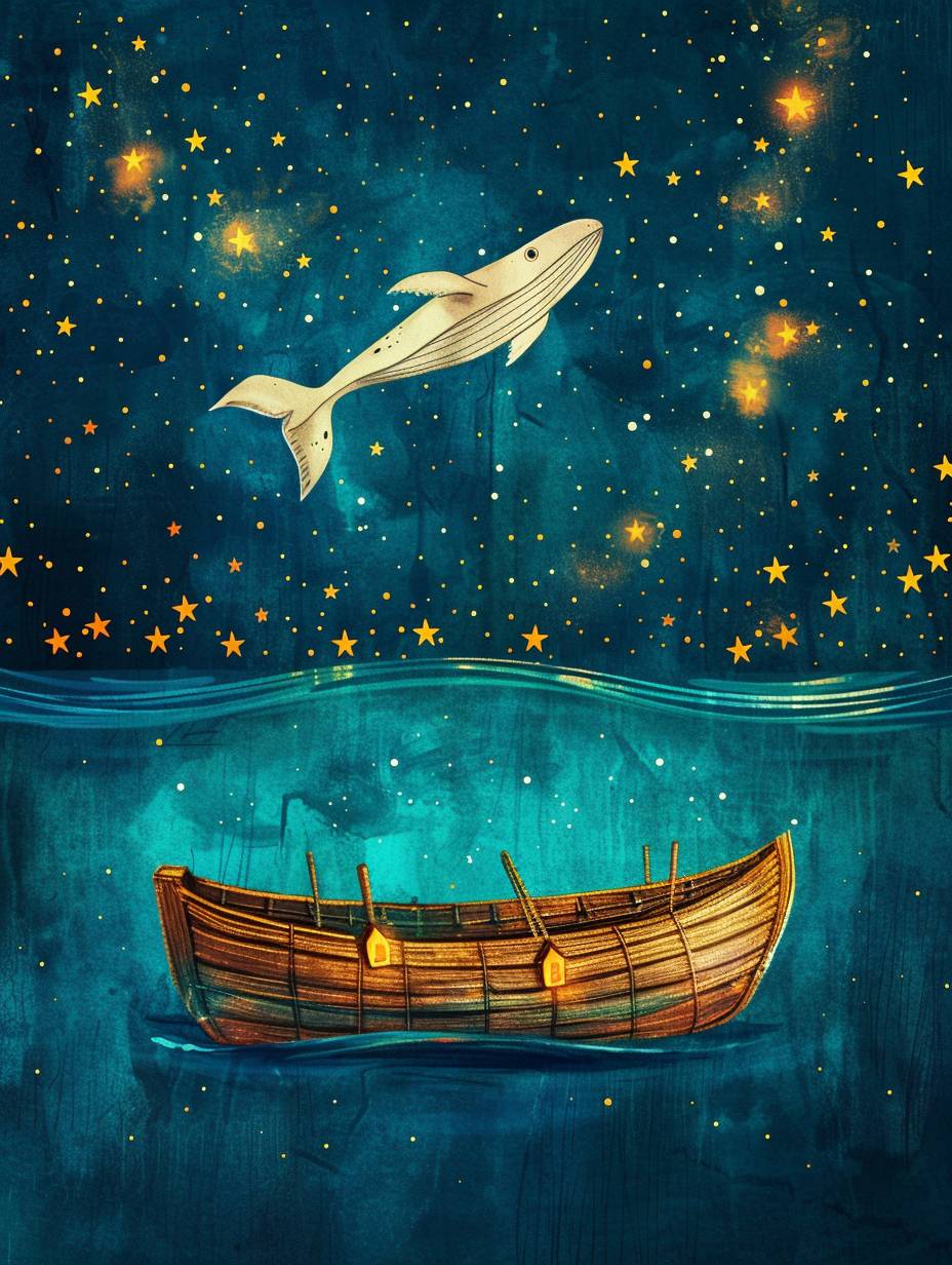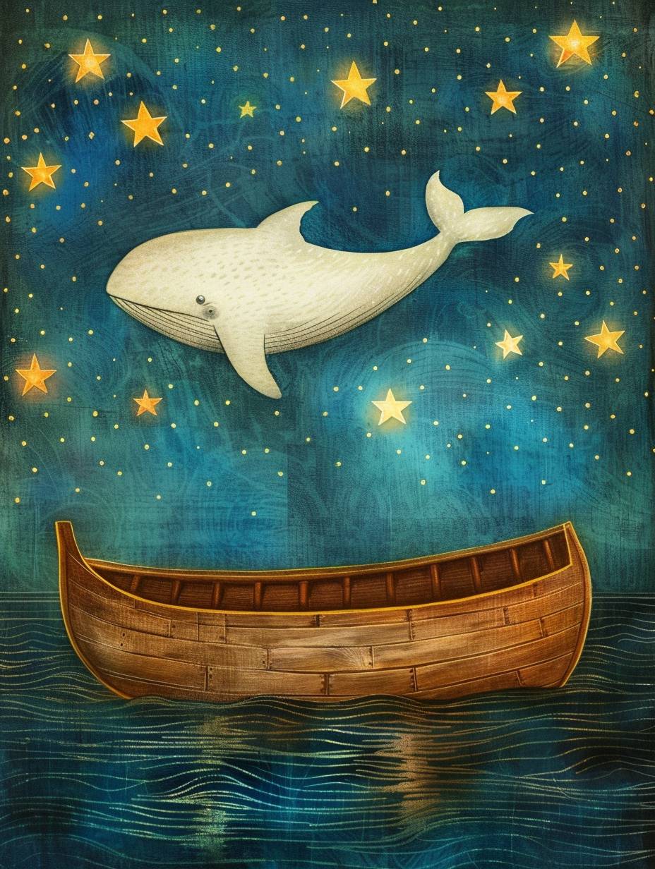 Un petit bateau en bois flotte dans le ciel étoilé, avec une adorable petite baleine blanche volant au-dessus, créant une atmosphère de rêve et de fantaisie.