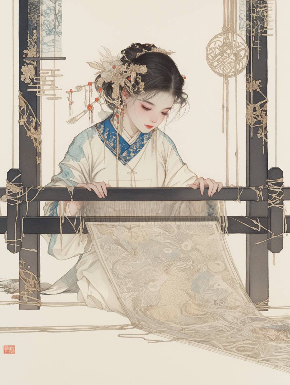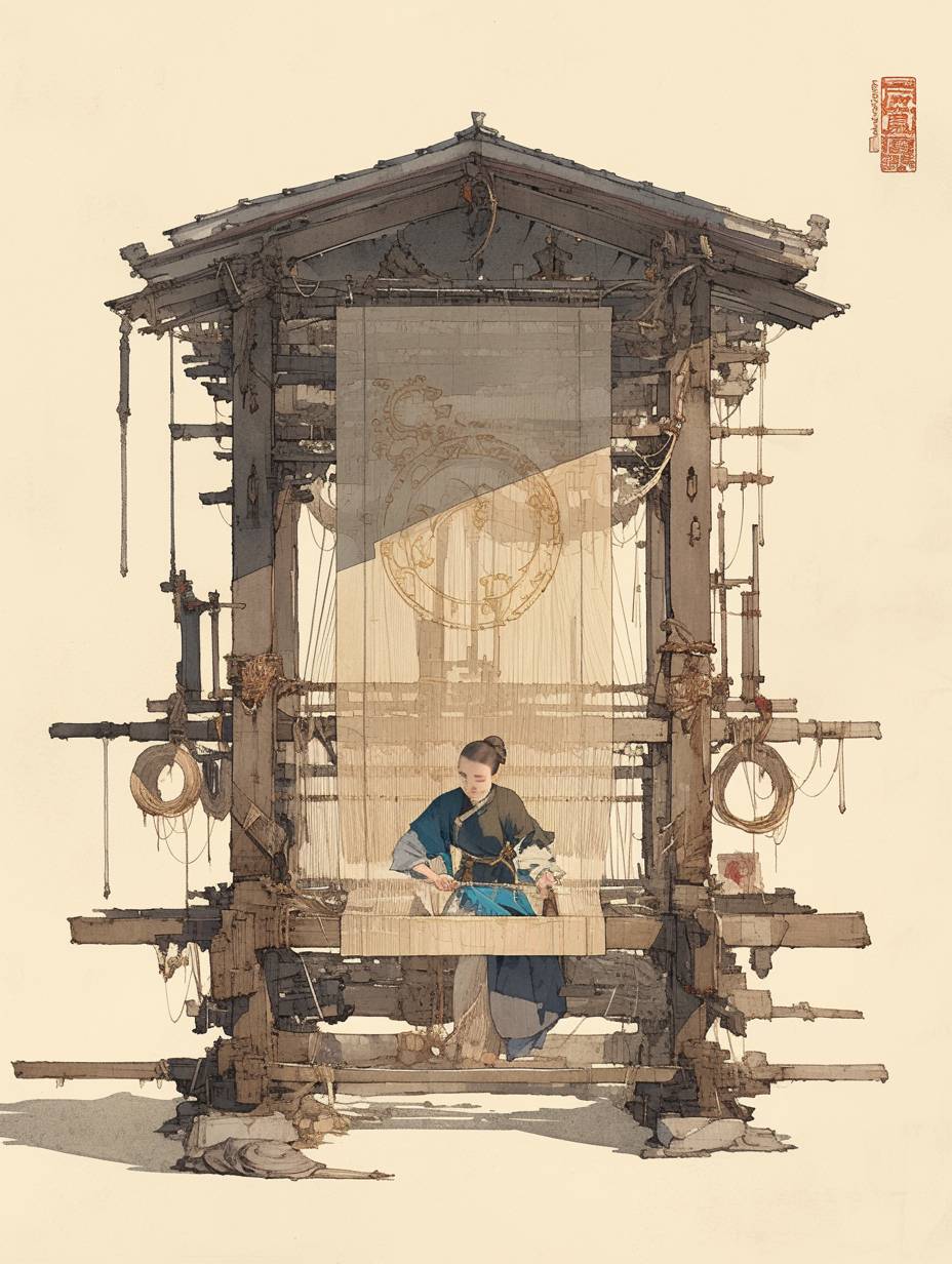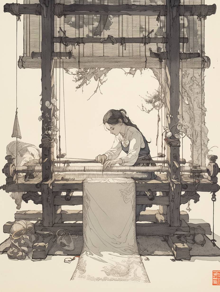 A woman is sitting in front of a loom, she is weaving, a loom made of wood, the loom has a cloth with complex patterns, there are shelves around, the shelves hang on the cloth, fine brush paintings, freehand, ink style, Chinese, meticulous painting,He Jiaying, Qi Baishi, traditional paintings, extremely detailed --ar 3:4 --stylize 400 --niji 6
