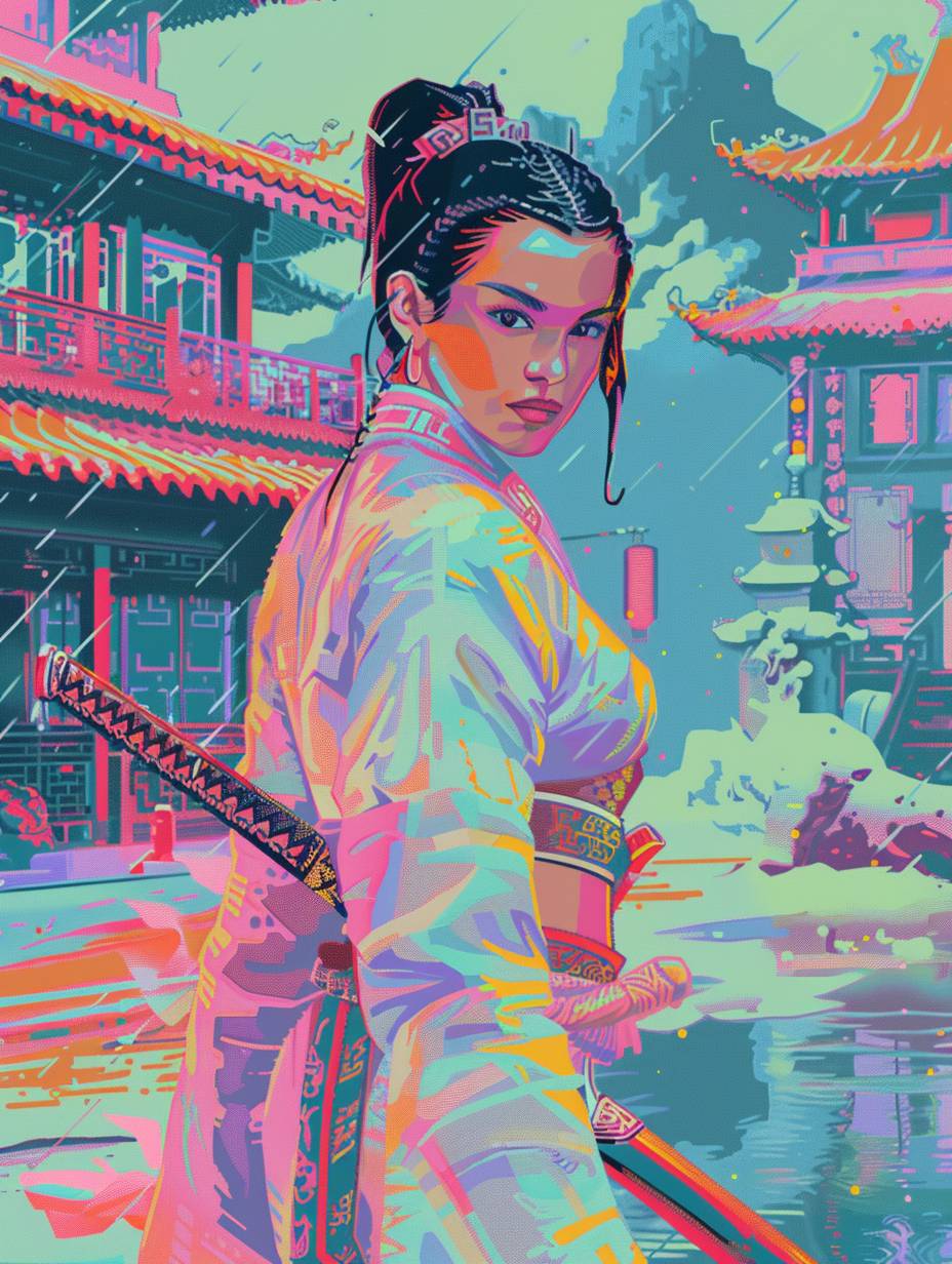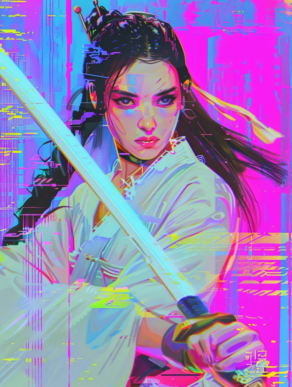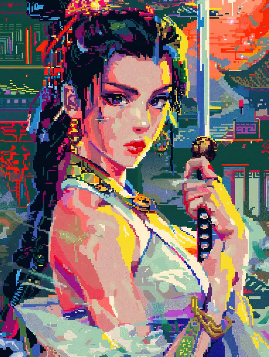 in the style of a 1980s arcade game, wuxia bandit princess, white silk, lurid 8-bit colours, pixelated astropunk --ar 3:4 --v 6.0