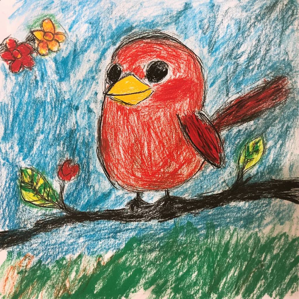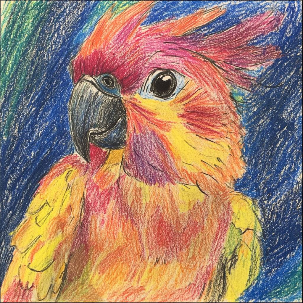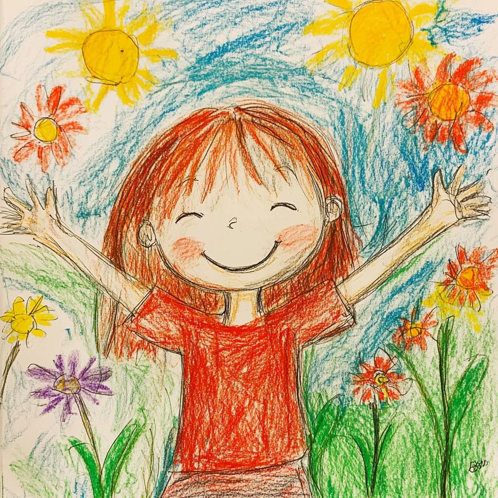 Un dessin fait par un enfant de 5 ans avec des crayons de cire.