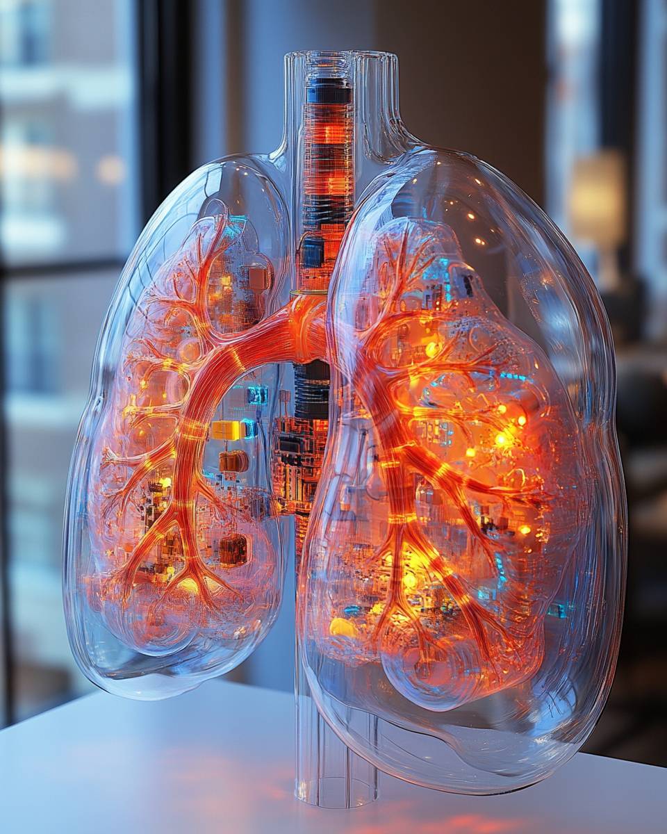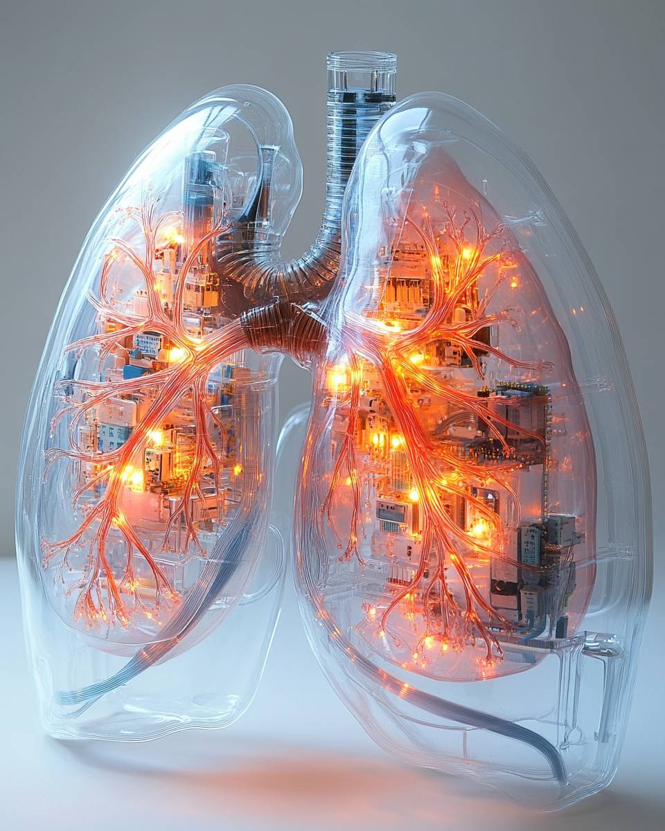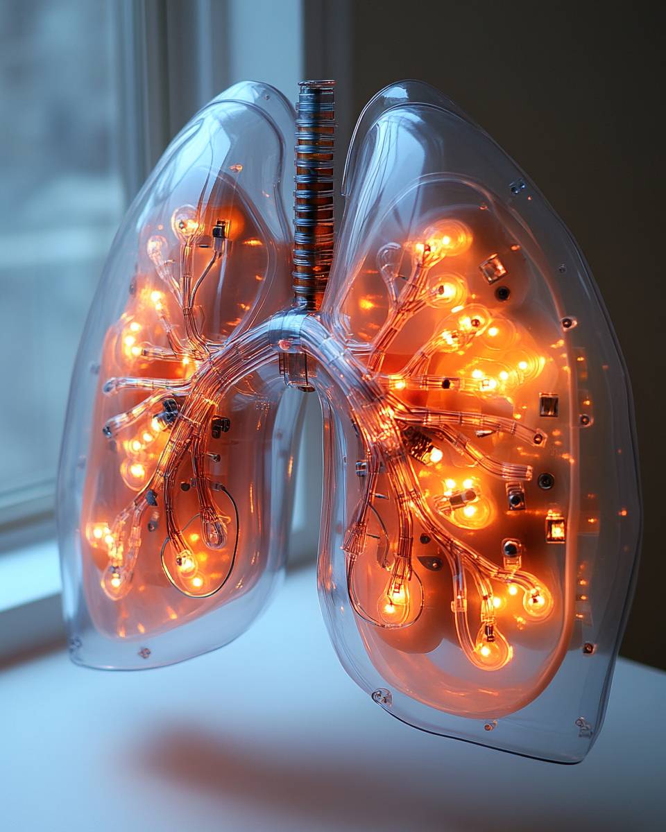 Poumons détaillés et réalistes à des fins éducatives, fabriqués en plastique transparent clair, magnifiquement présentés sur un fond blanc, contenant de nombreuses pièces internes complexes de différentes couleurs, des câbles et des pièces électriques, des poumons éclairés par rétroéclairage, des anatomies réalistes, des réseaux détaillés, des complexités de circuits, des réseaux entrelacés, des détails fins photographiques, des couleurs vives et éclatantes.