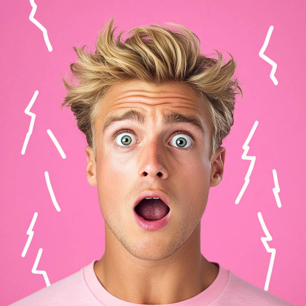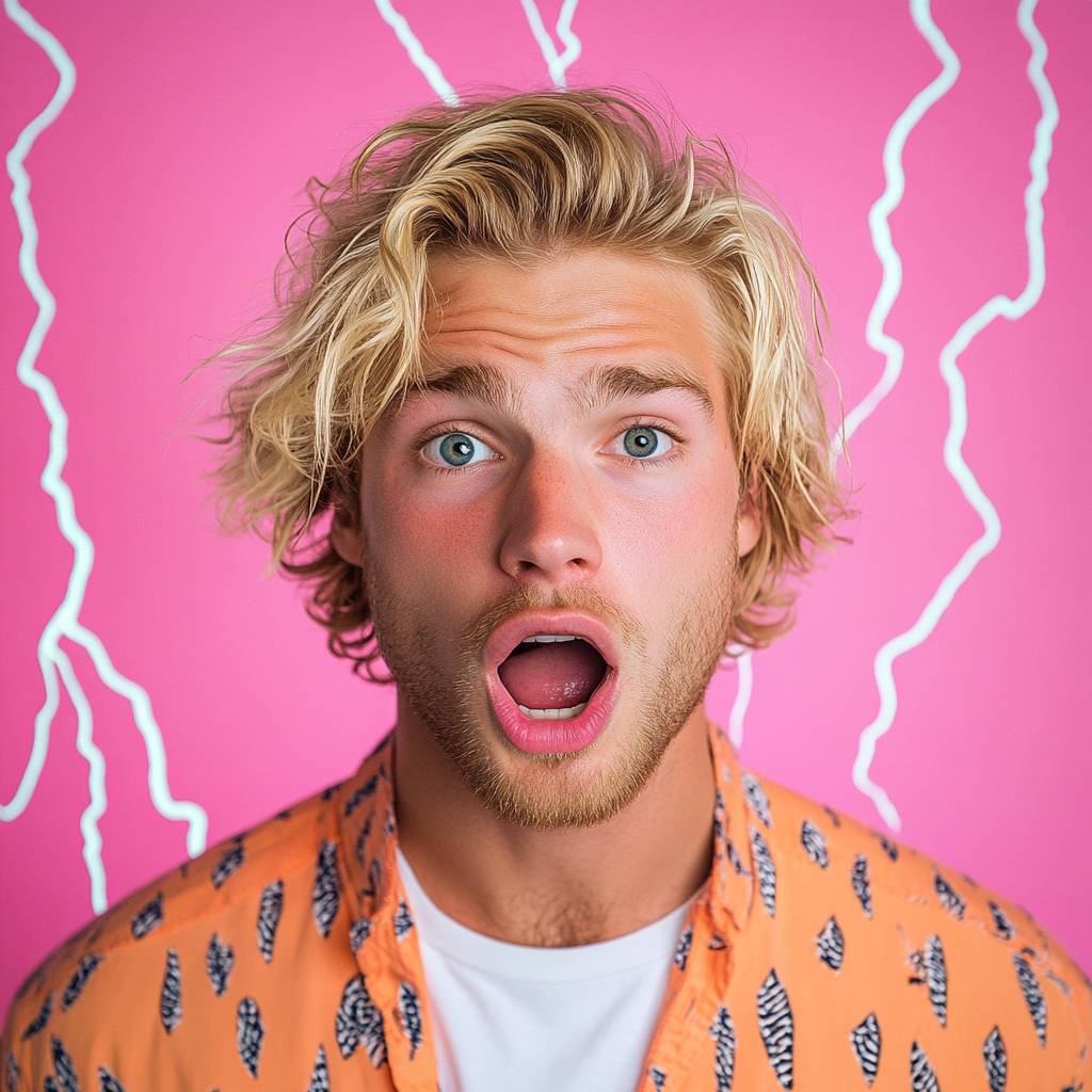 European and American male celebrity with golden hair, male celebrity with golden hair,A mashup of a pink background with lightning bolts and a cute blonde man head with a surprised expression. --v 6.1