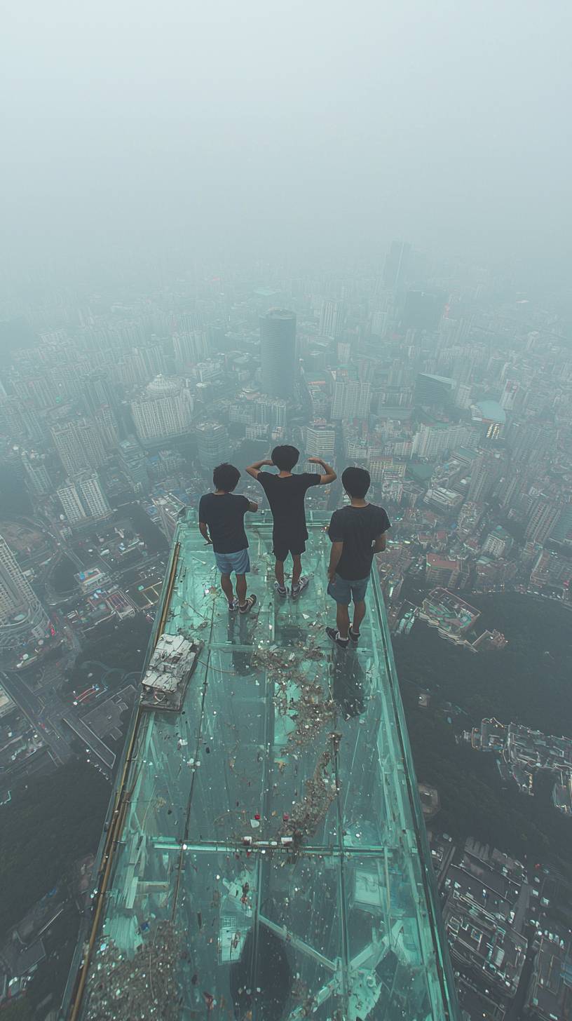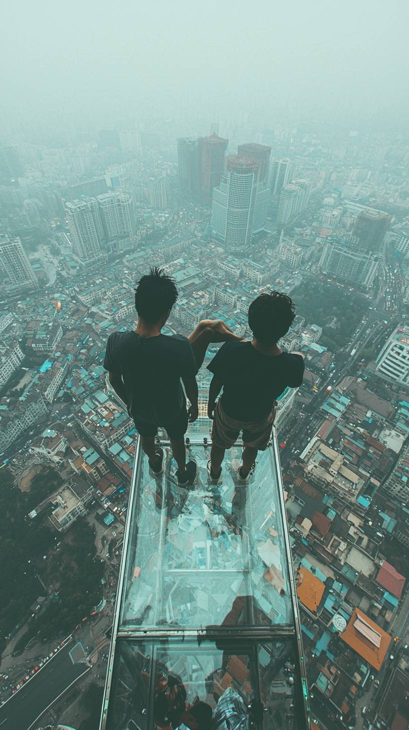 Two men standing on top of a glass, transparent, skinny needle-like structure. They all have black hair and are wearing t-shirts, looking down at their feet as if it were an adventure photo shoot in China's sky city with many high-rise buildings below them. One man is holding the side of his head, while another is reaching up to him from behind. The image was taken with an iPhone camera, with the background showing a panoramic view of Beijing. --ar 9:16 --quality 2 --style raw --personalize as4f8iq --stylize 400 --v 6.1
