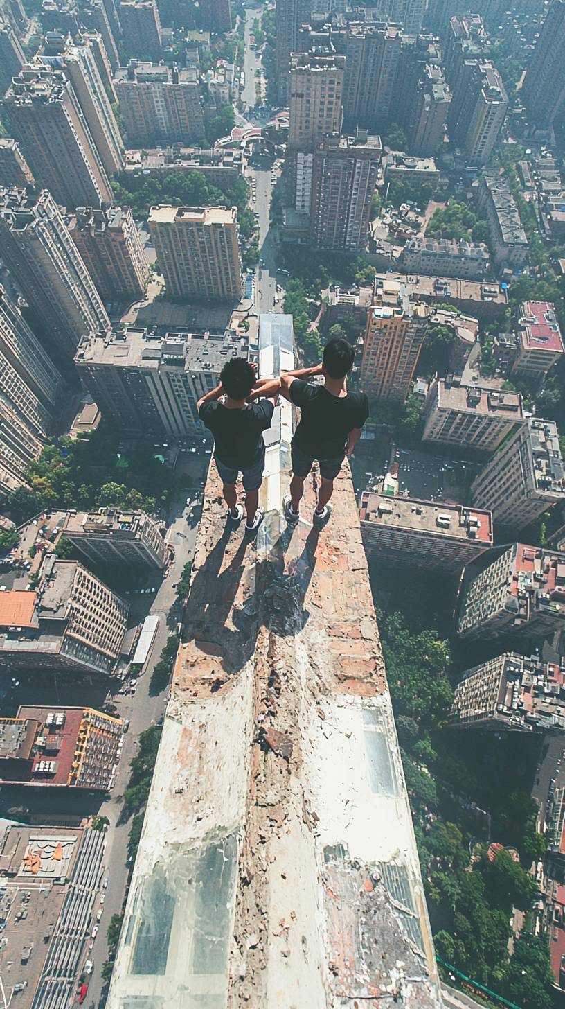Deux hommes se tiennent au sommet d'une structure mince, transparente et en verre, semblable à une aiguille. Ils ont tous les deux les cheveux noirs et portent des t-shirts, regardant vers leurs pieds comme si c'était une séance photo d'aventure dans la ville du ciel de Chine, avec de nombreux gratte-ciel en dessous d'eux. Un homme tient le côté de sa tête, tandis qu'un autre tend la main à partir de l'arrière. L'image a été prise avec un iPhone, avec un arrière-plan montrant une vue panoramique de Pékin.
