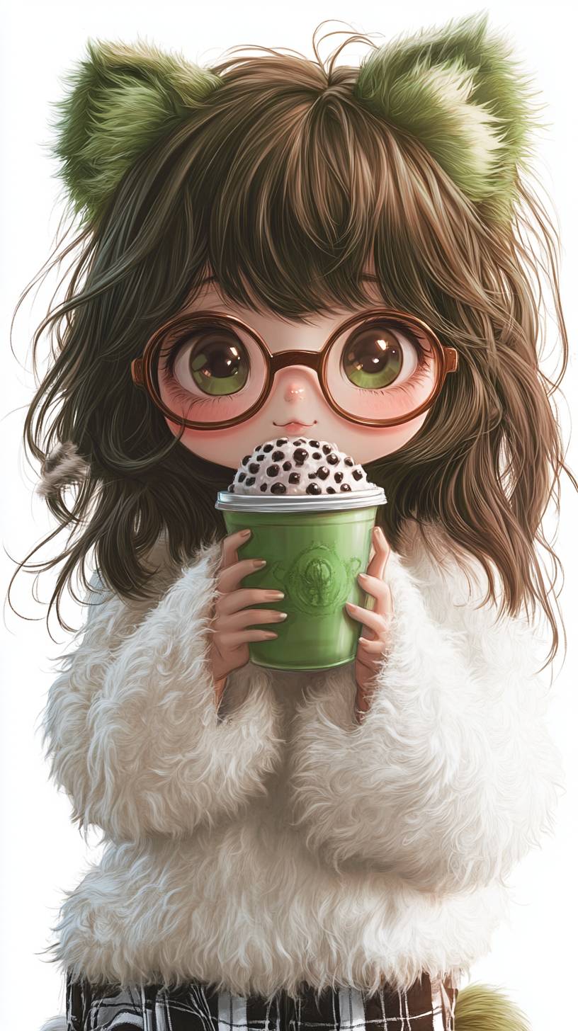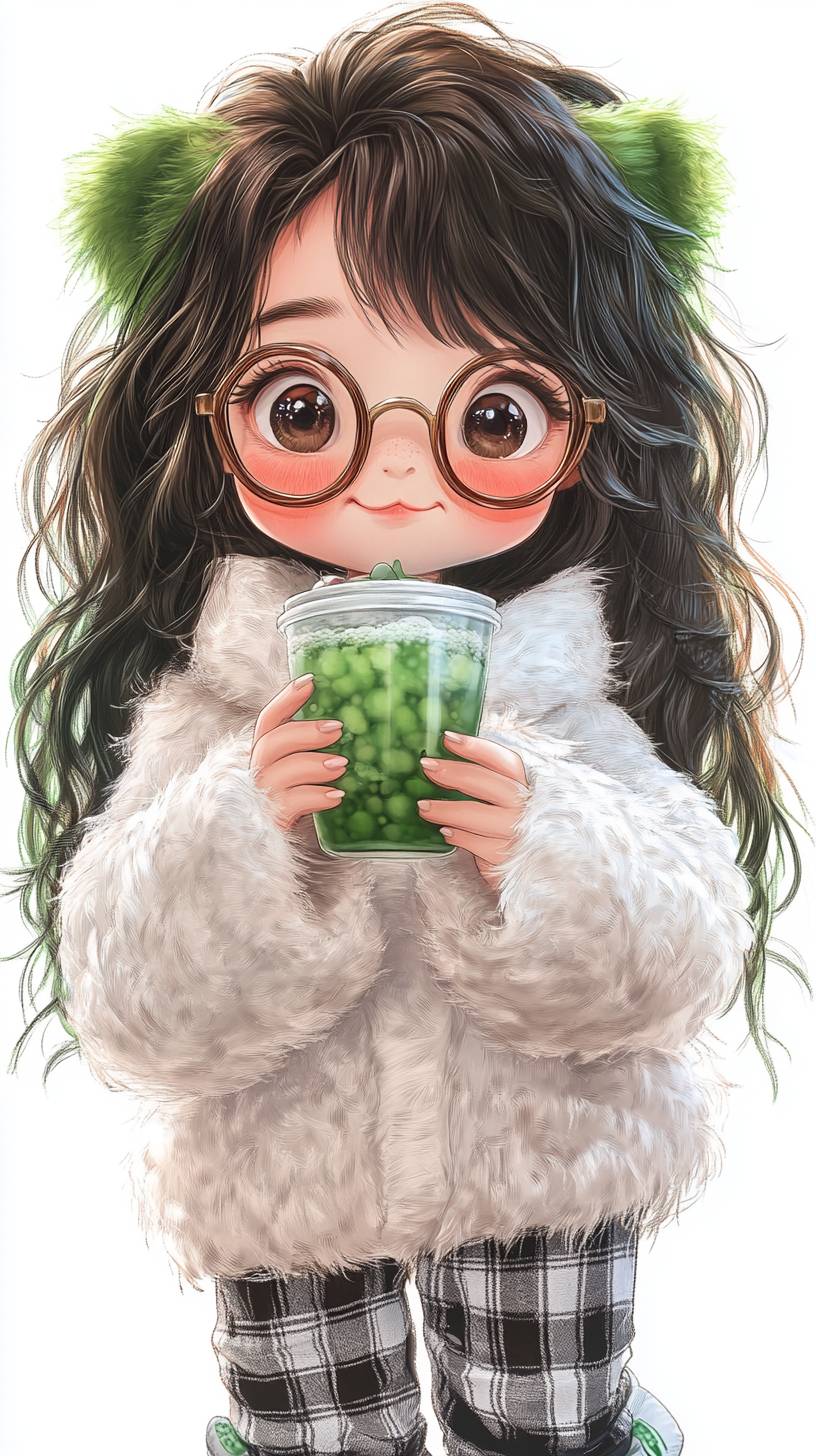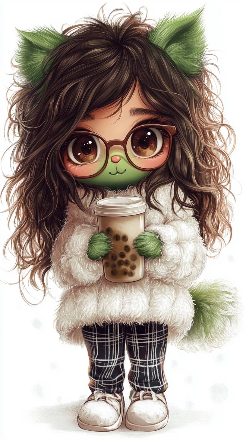 A highly detailed Chibi hyper-realistic style illustration of a cute and adorable 13-year-old female furry Grinch inspired character with green furry face, dark brown hair that is middle-parted, wearing glasses, and holding a boba tea. She has big, expressive eyes, soft green fur, and a cozy look. She is wearing a fluffy oversized white sweater, black and white buffalo plaid pajama pants, and slippers. The style should feature detailed shading and highlights to give the fur and fabric a soft, realistic appearance. The character should have a warm and inviting expression, isolated on a white background --ar 9:16 --v 6.1