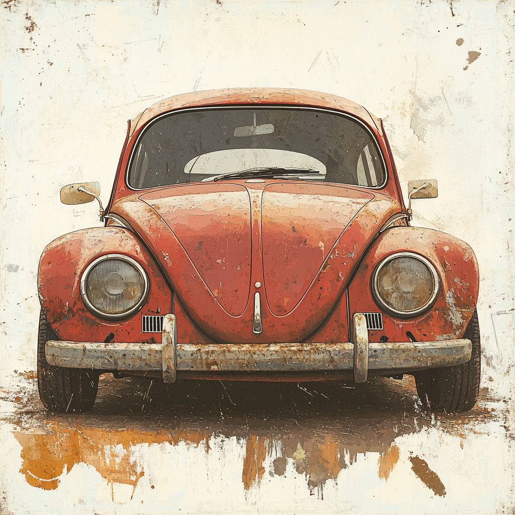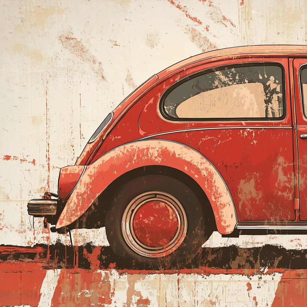 vw beetle vintage poster, in the style of rustic simplicity, gritty reportage, kombuchapunk, rusty debris, hyper-realistic animal illustrations, red and amber, wide lens --style raw --stylize 50 --v 6.1
