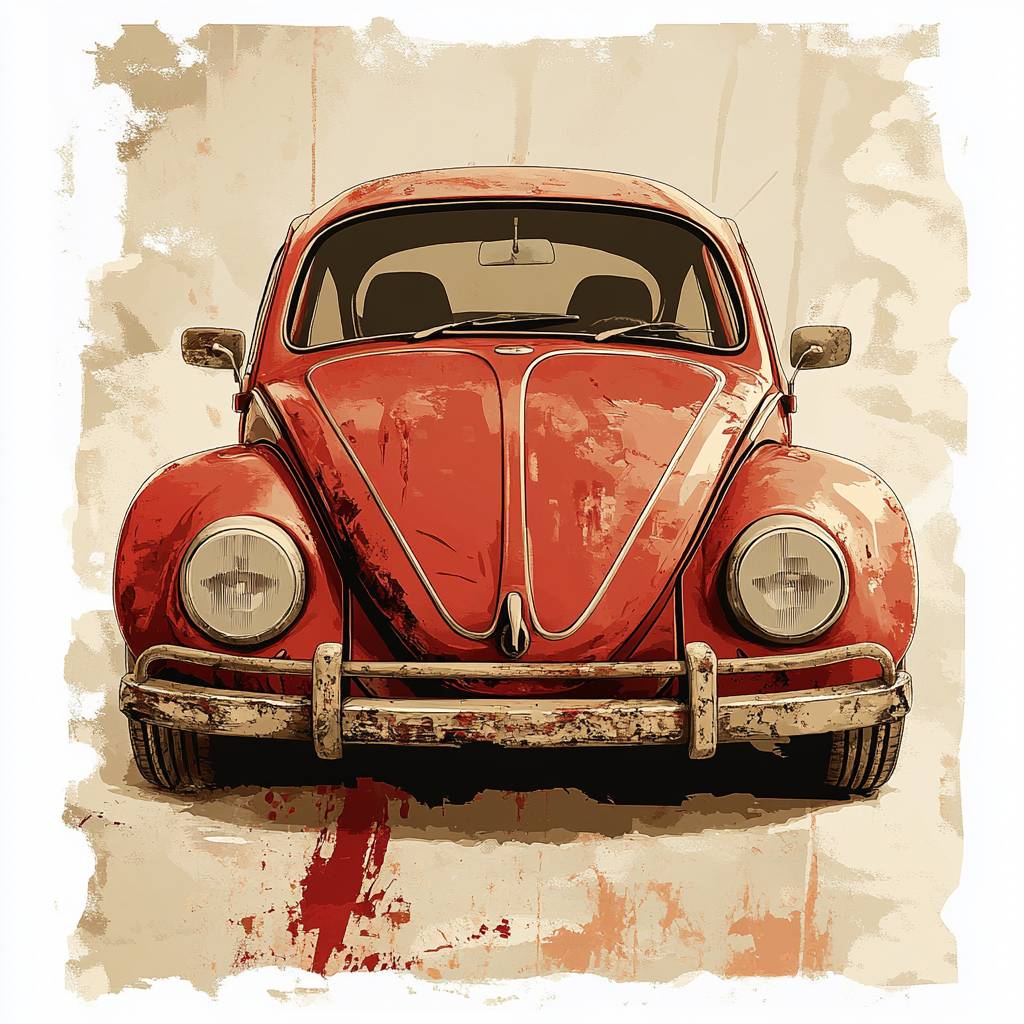 Affiche vintage de la Beetle montrant une simplicité rustique et un style de reportage brut.