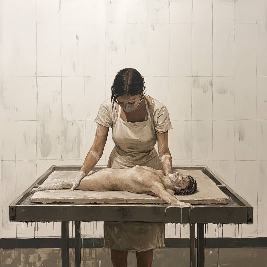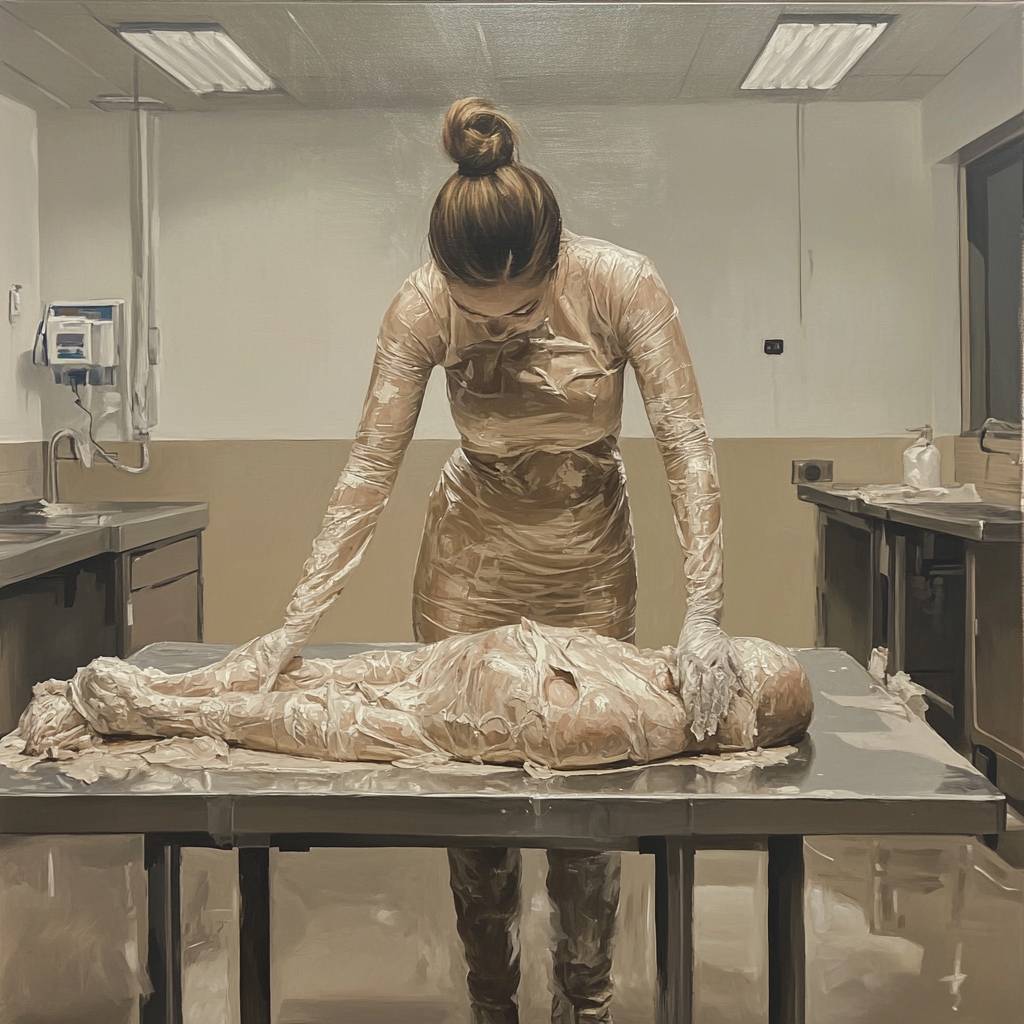 full body portrait painting of a woman plastering her whole body with plaster gauze on a steel table in a morgue. She appears to be standing through the table. She is seen in action, as if in a rush. In style of michael borremans --v 6.1