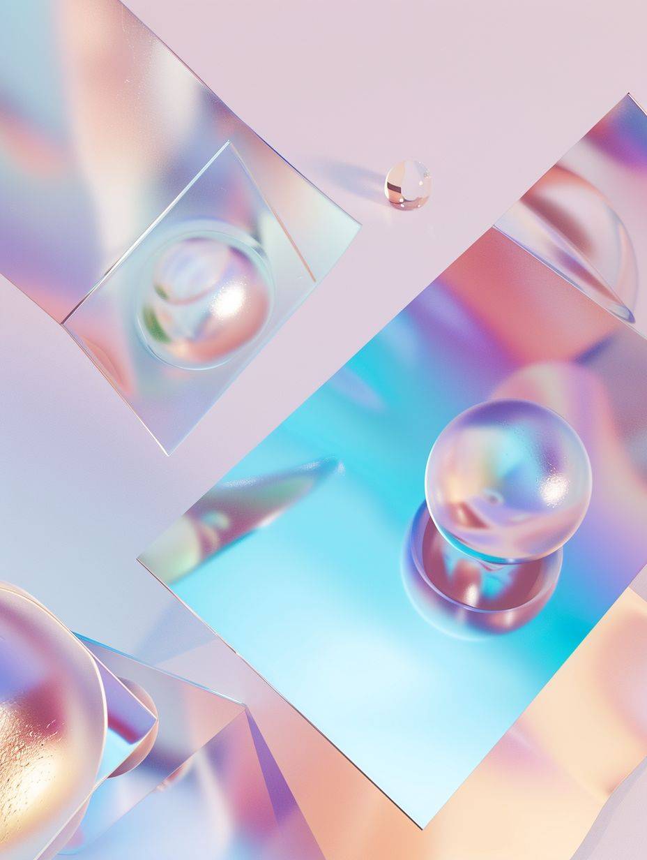 Un modèle de carte de visite sur un verre irisé 3D flottant, présentant des formes organiques et la réfraction de la lumière.