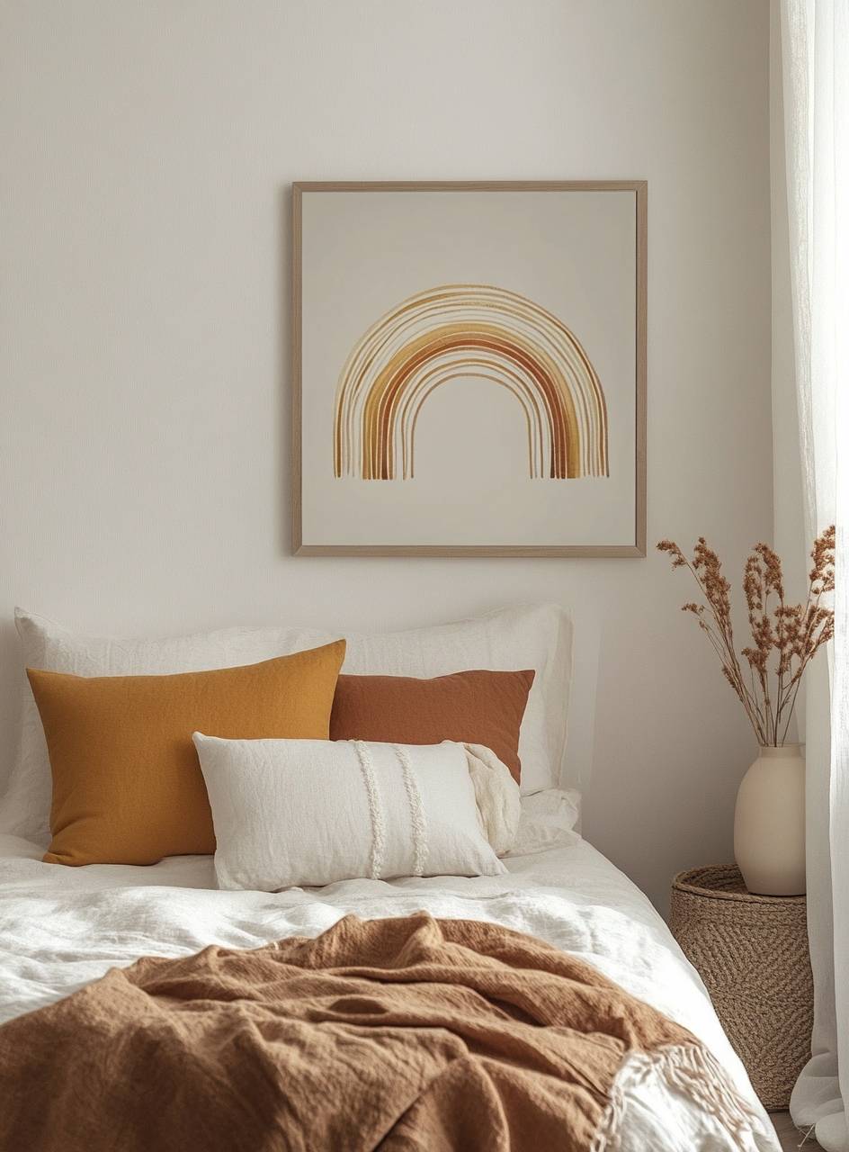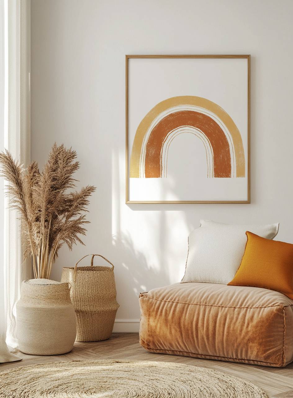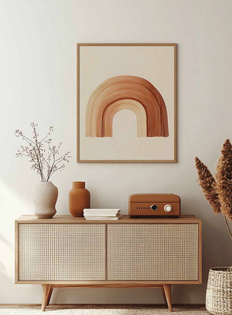 Affiche boho minimaliste avec un arc-en-ciel, des formes simples et des couleurs sourdes.