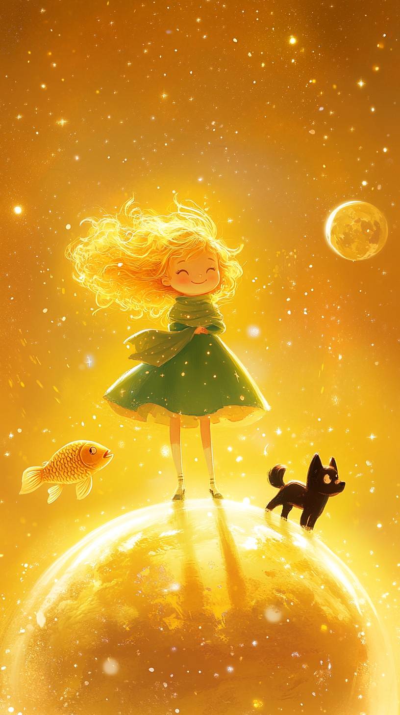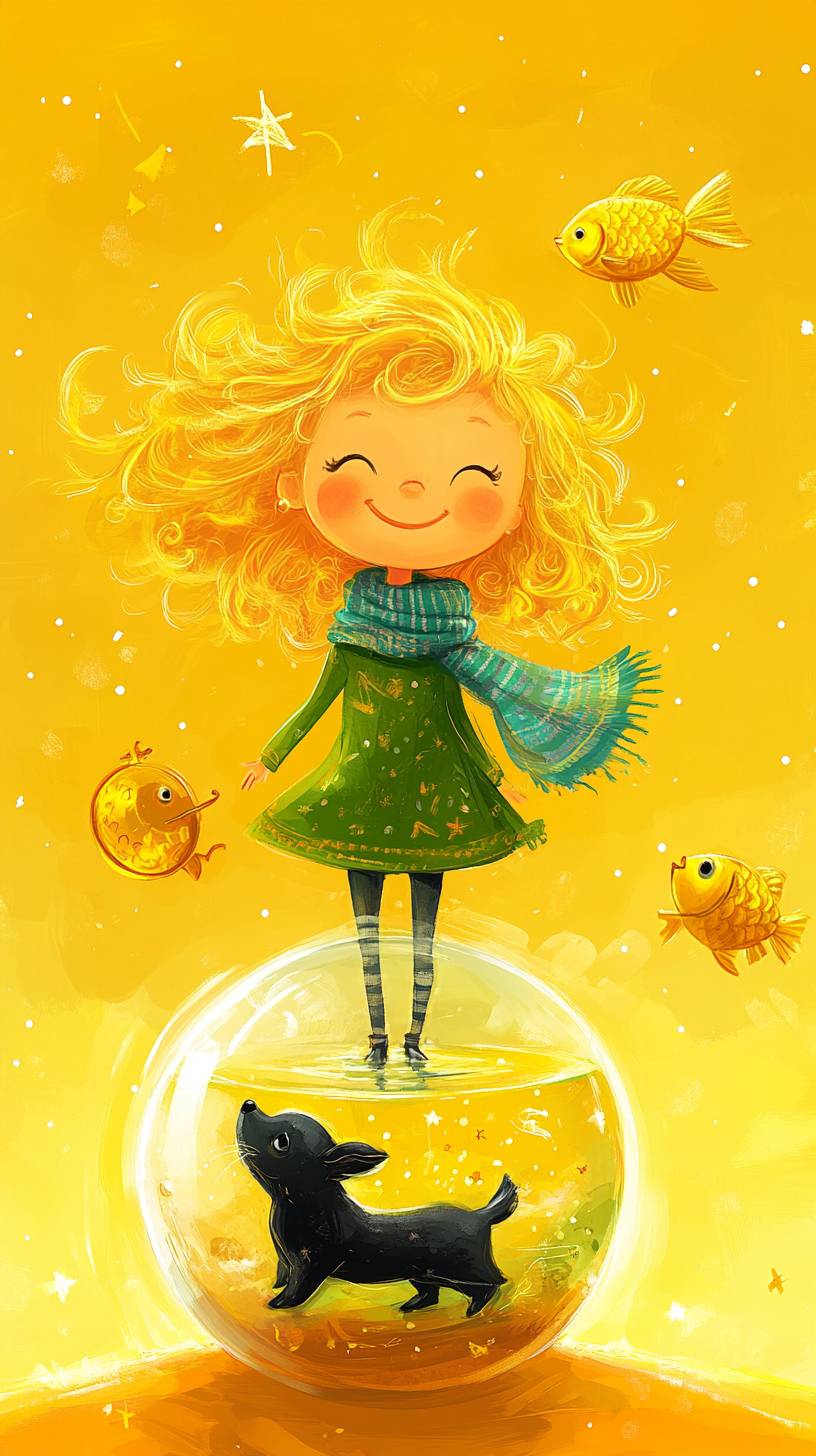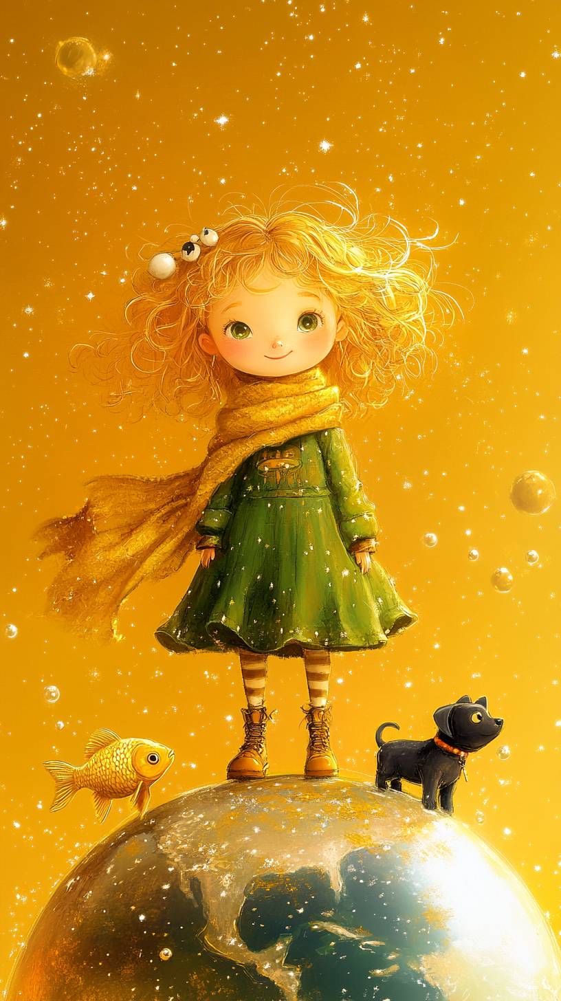 The Little curly blonde Princess standing on the planet, yellow background, cartoon style, simple lines, bright colors, cute little princess in green with scarf with black puppy and a golden fish in a round water tank, planet earth under her feet, starry sky floating around her, light and shadow effects, yellow tones, fantastic world, fantasy., HD, high resolution, high detail, --ar 9:16 --v 6.1