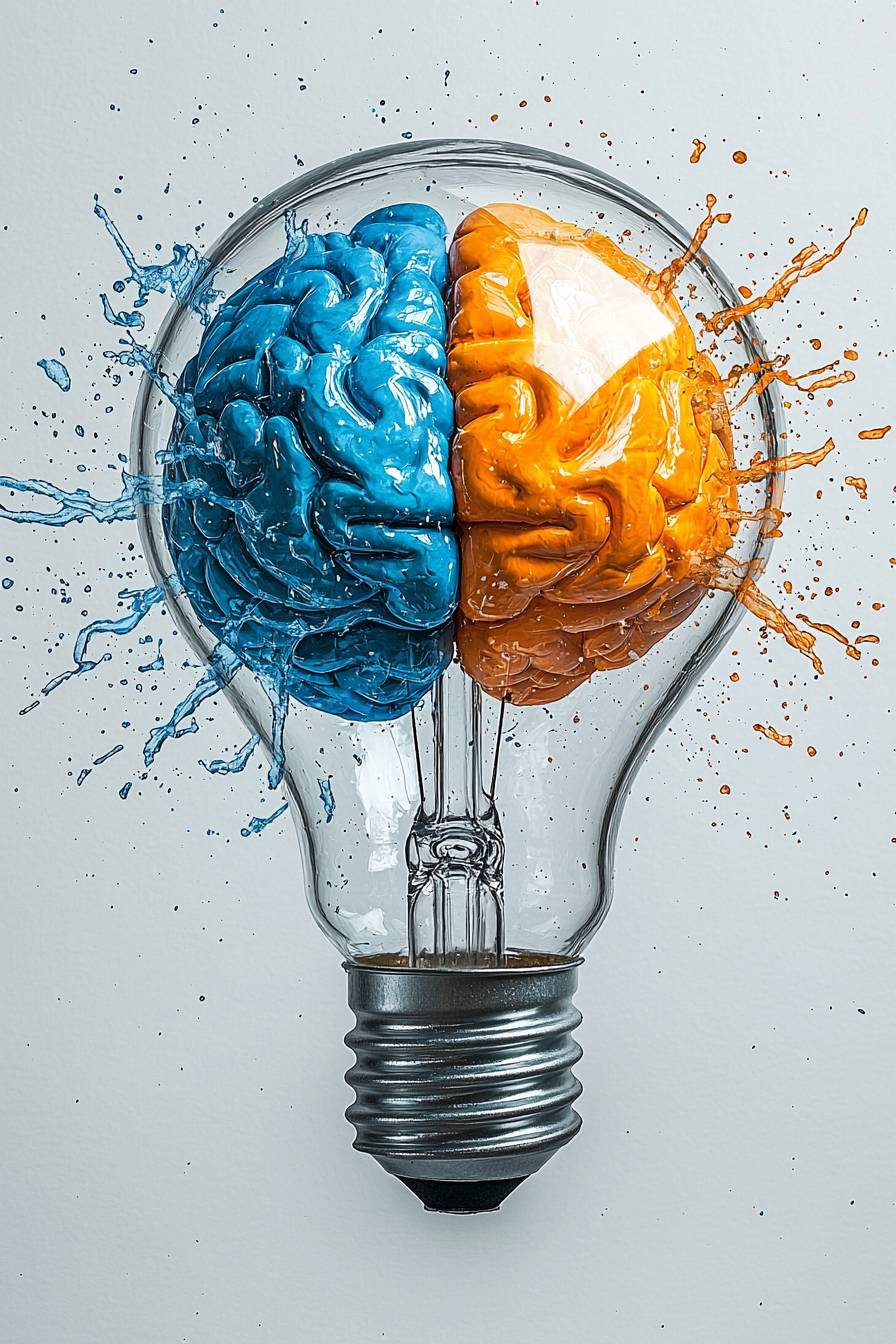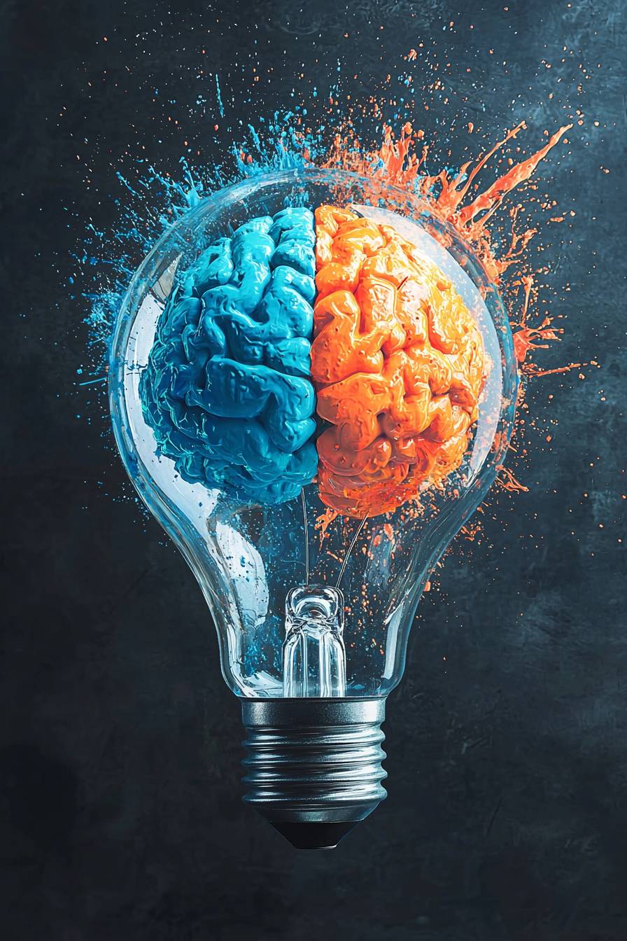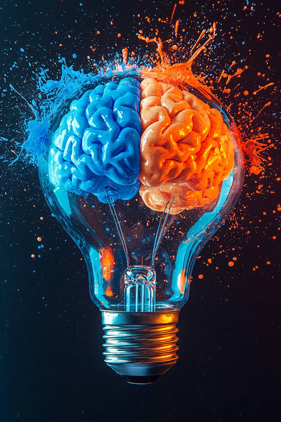 A vibrant and creative illustration of a light bulb with a brain inside, divided into two hemispheres. The left side of the brain is blue, representing logic and analytical thinking, while the right side is orange, symbolizing creativity and imagination. Splashes of colorful paint in blue and orange burst from the bulb, creating a dynamic, energetic effect. Detailed reflections on the glass and metal base enhance realism, blending artistic and scientific themes. Bright colors, high contrast, modern design, artistic symbolism --chaos 10 --ar 2:3 --quality 2 --stylize 250 --v 6.1