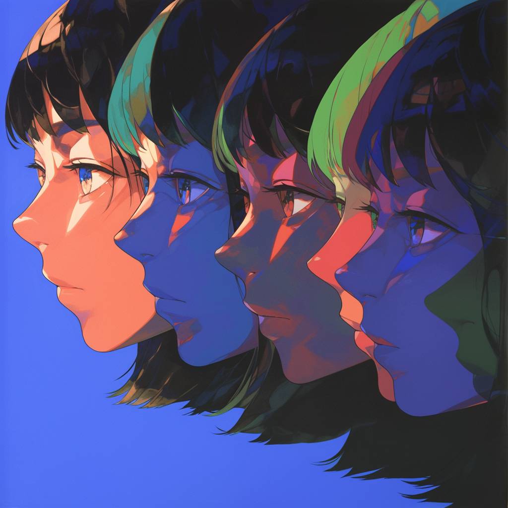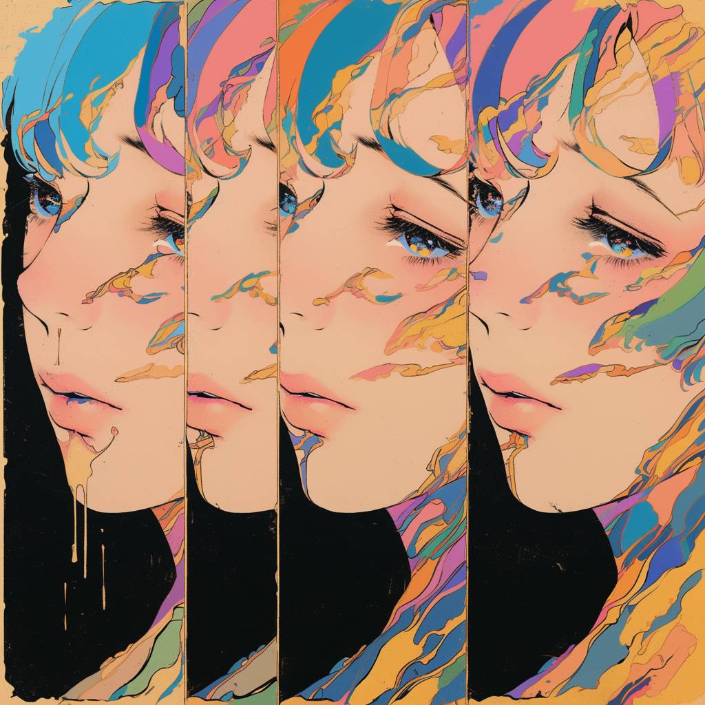 masterpiece, best quality, extremely detailed, insanely detailed, gradation paper, Hisashi Eguchi style, dynamic manga style, flat and vivid color, A profile of a woman's face is repeated five times, with each layer slightly shifted horizontally, creating a staggered, layered effect. The faces are aligned in a row, with each one subtly displaced to the right, giving the impression of multiple overlapping images. The woman's features are soft and graceful, and the layers gradually fade into one another, creating a sense of depth and motion. The color palette is simple and uses soft gradients to distinguish each layer while maintaining a harmonious flow. The background is minimalistic, allowing the focus to stay on the shifted profiles, giving the image a surreal and abstract aesthetic --ar 1:1 --niji 6