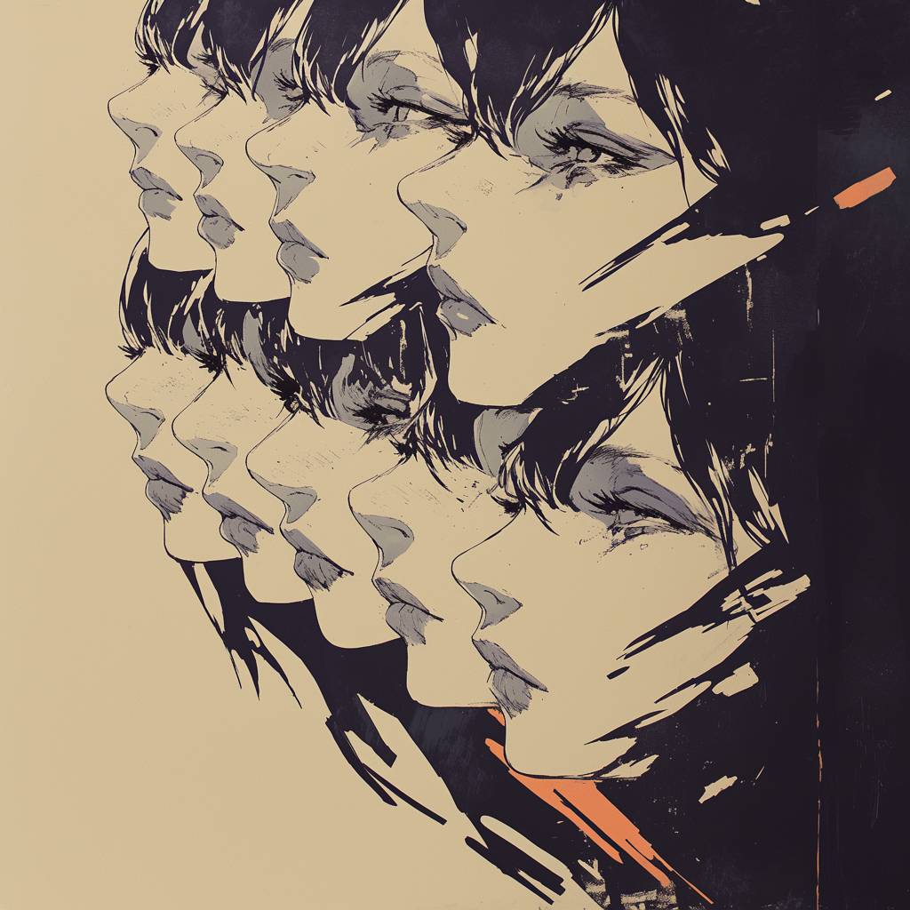 Chef-d'œuvre, meilleure qualité, extrêmement détaillé, follement détaillé, papier dégradé, style Hisashi Eguchi, style manga dynamique, couleurs plates et vives. Un profil du visage d'une femme est répété cinq fois, chaque couche étant légèrement décalée horizontalement, créant un effet en couches décalées. Les visages sont alignés en rangée, chacun étant subtilement déplacé vers la droite, donnant l'impression de plusieurs images superposées. Les traits de la femme sont doux et gracieux, et les couches s'estompent progressivement les unes dans les autres, créant un sens de profondeur et de mouvement. La palette de couleurs est simple et utilise des dégradés doux pour distinguer chaque couche tout en maintenant un flux harmonieux. L'arrière-plan est minimaliste, permettant de garder l'accent sur les profils décalés, donnant à l'image une esthétique surréaliste et abstraite.