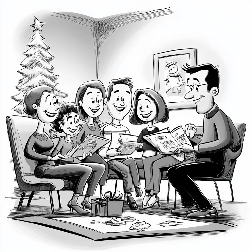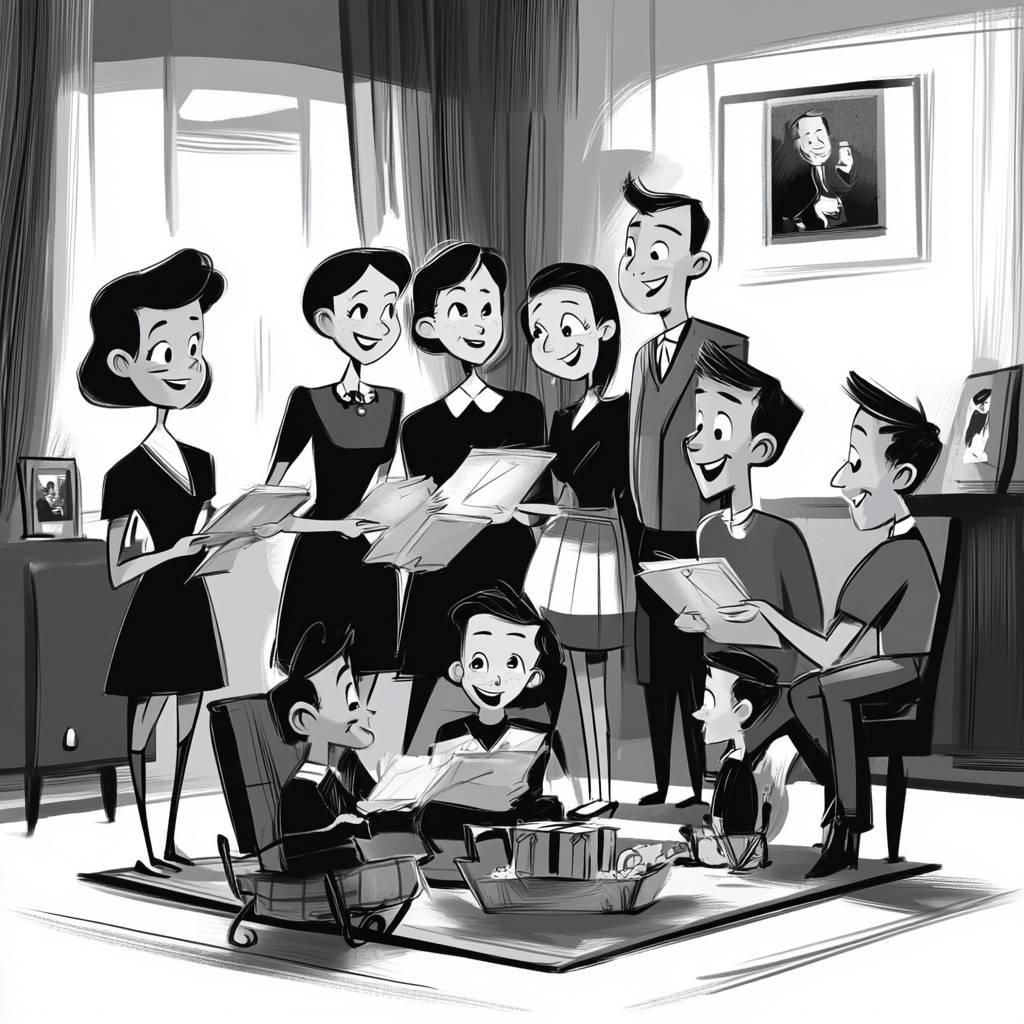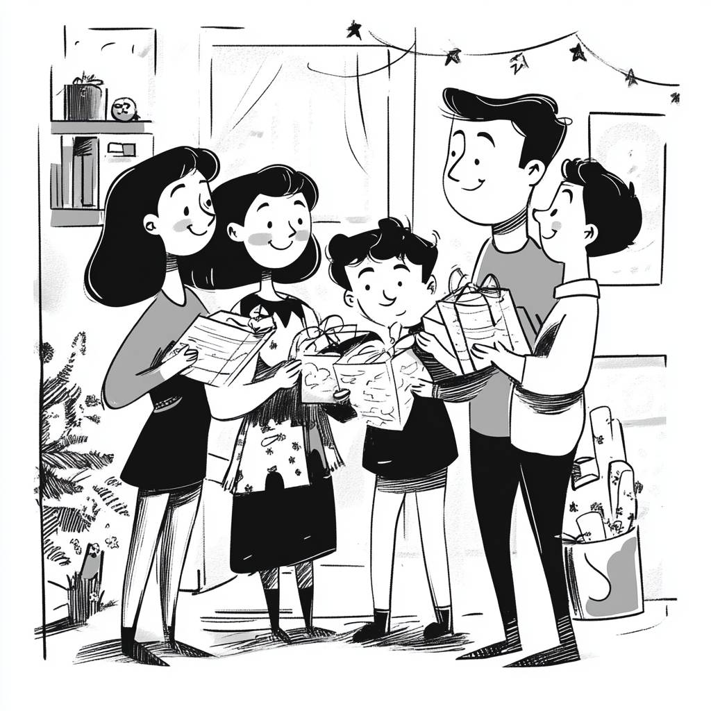 Un dessin animé moderne en noir et blanc de la famille et des amis partageant leurs listes de souhaits.