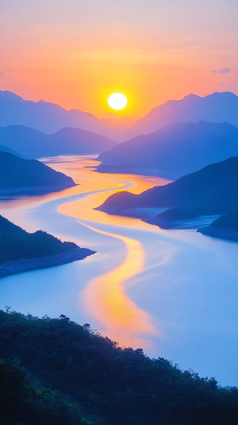 Le lever de soleil à l'est dépeint le soleil émergeant lentement de l'horizon, transformant le ciel du bleu foncé au rouge-orange, illuminant les montagnes, les rivières et la mer au petit matin.