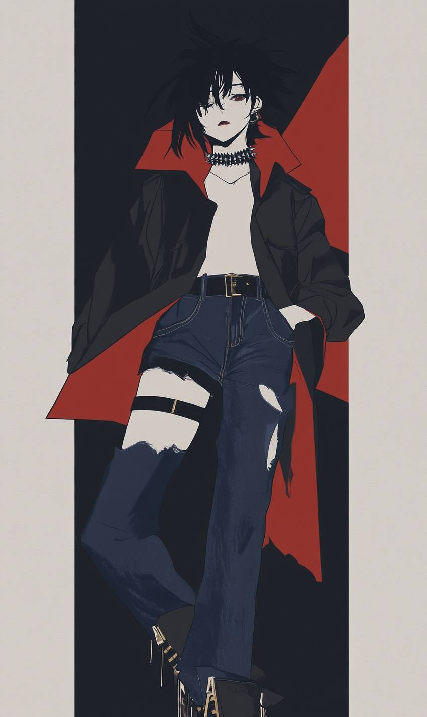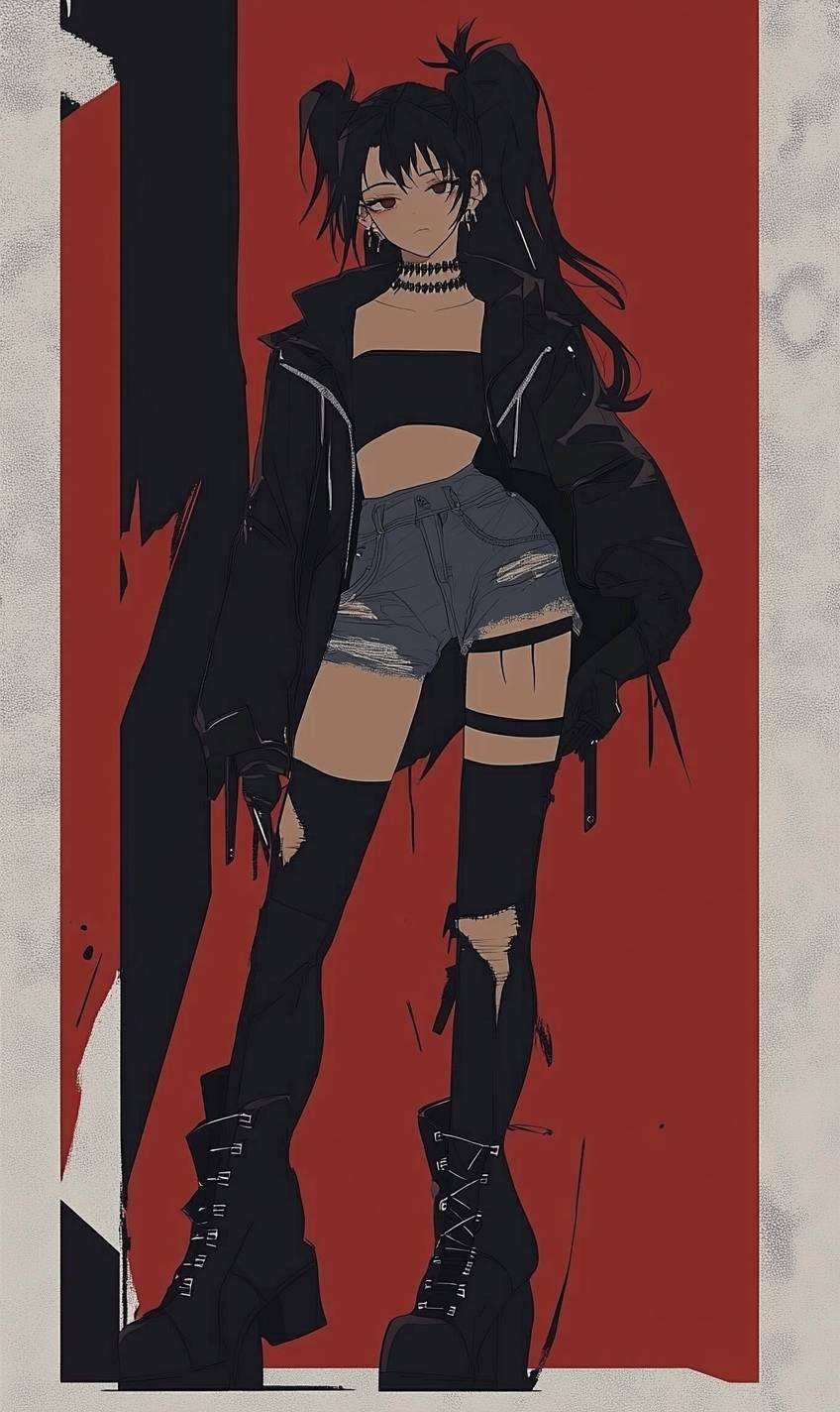Anime girl, punk style, leather jacket, ripped jeans, combat boots, spiked choker, messy hair, graffiti wall, rebellious energy. --sref 3022677299 --v 6.1 --ar 3:5