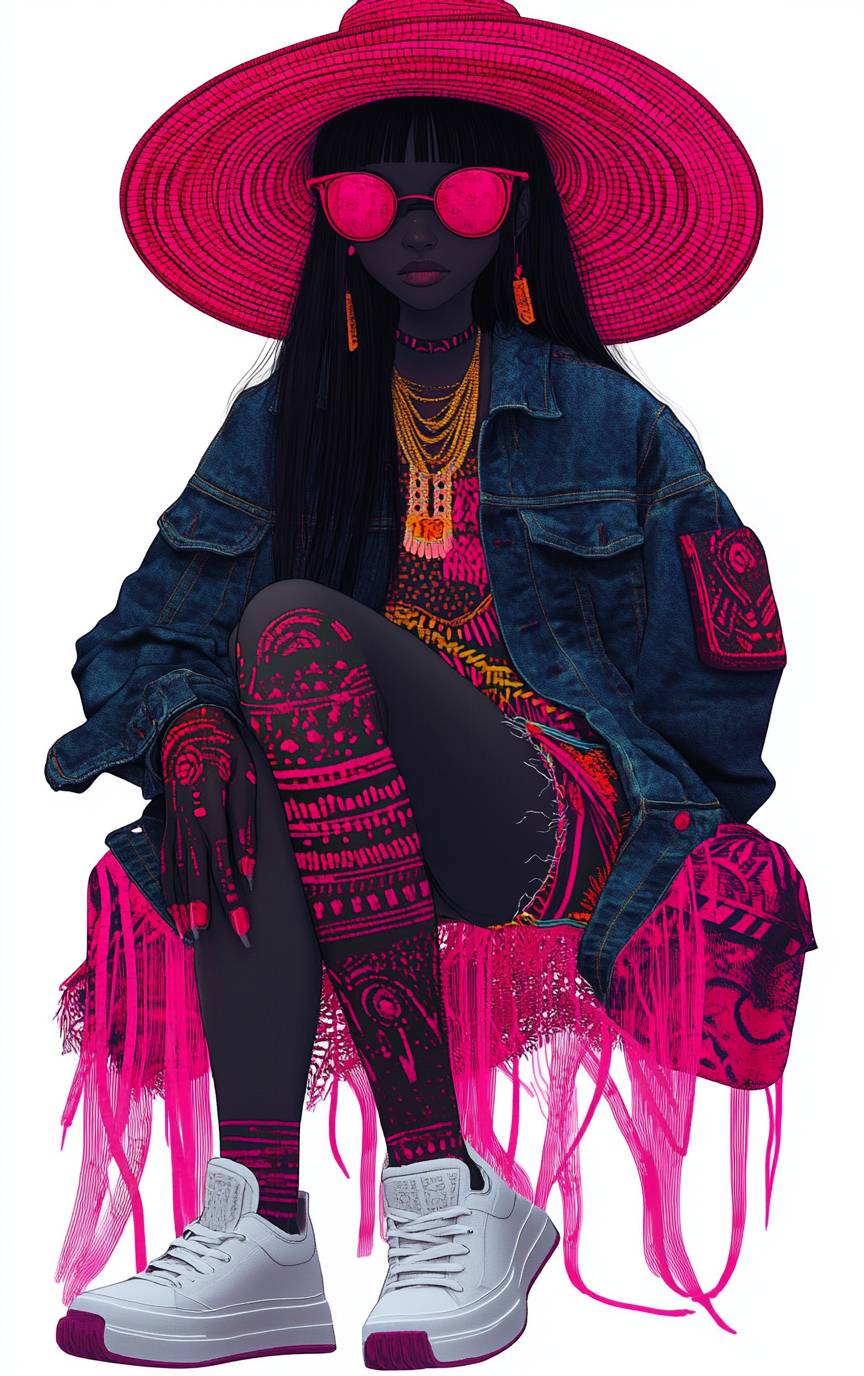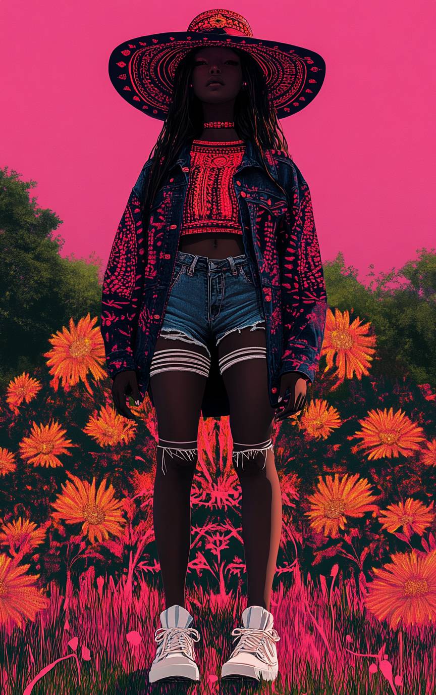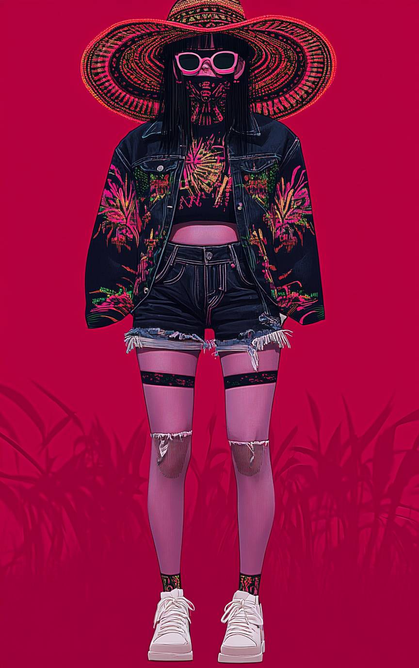 Une fille d'anime en veste en denim décontractée, shorts déchirés, baskets blanches et chapeau de soleil dans un parc.