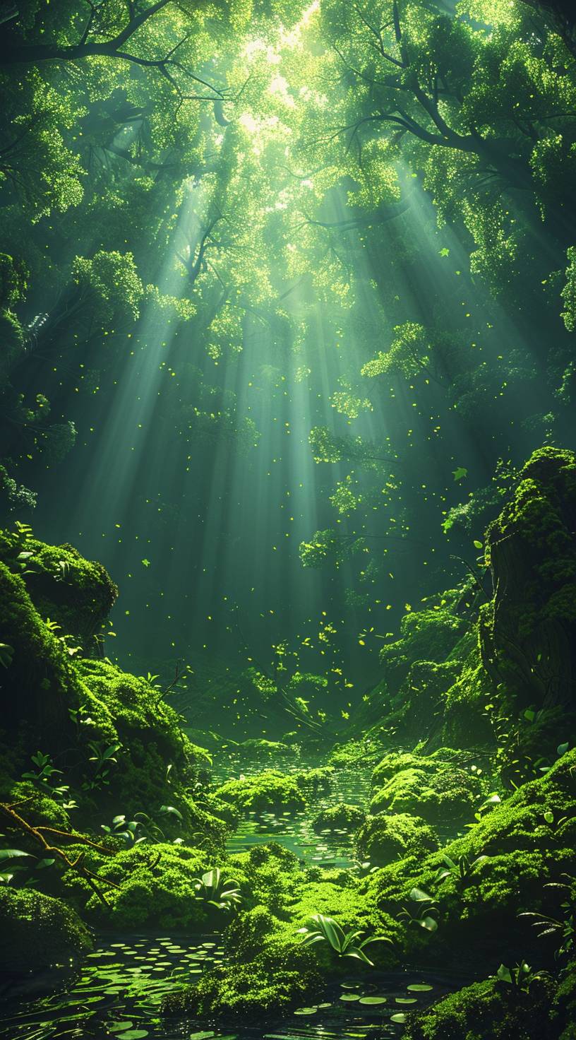 Un espace mystérieux dans une forêt profonde, humide et calme avec des arbres tombés couverts de mousse, un style lumineux, une ambiance d'aventure, de la poussière, des mycéliums et des flaques, style anime, visuel clé, ciel