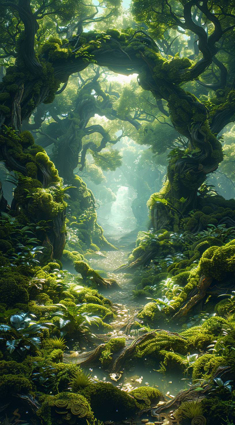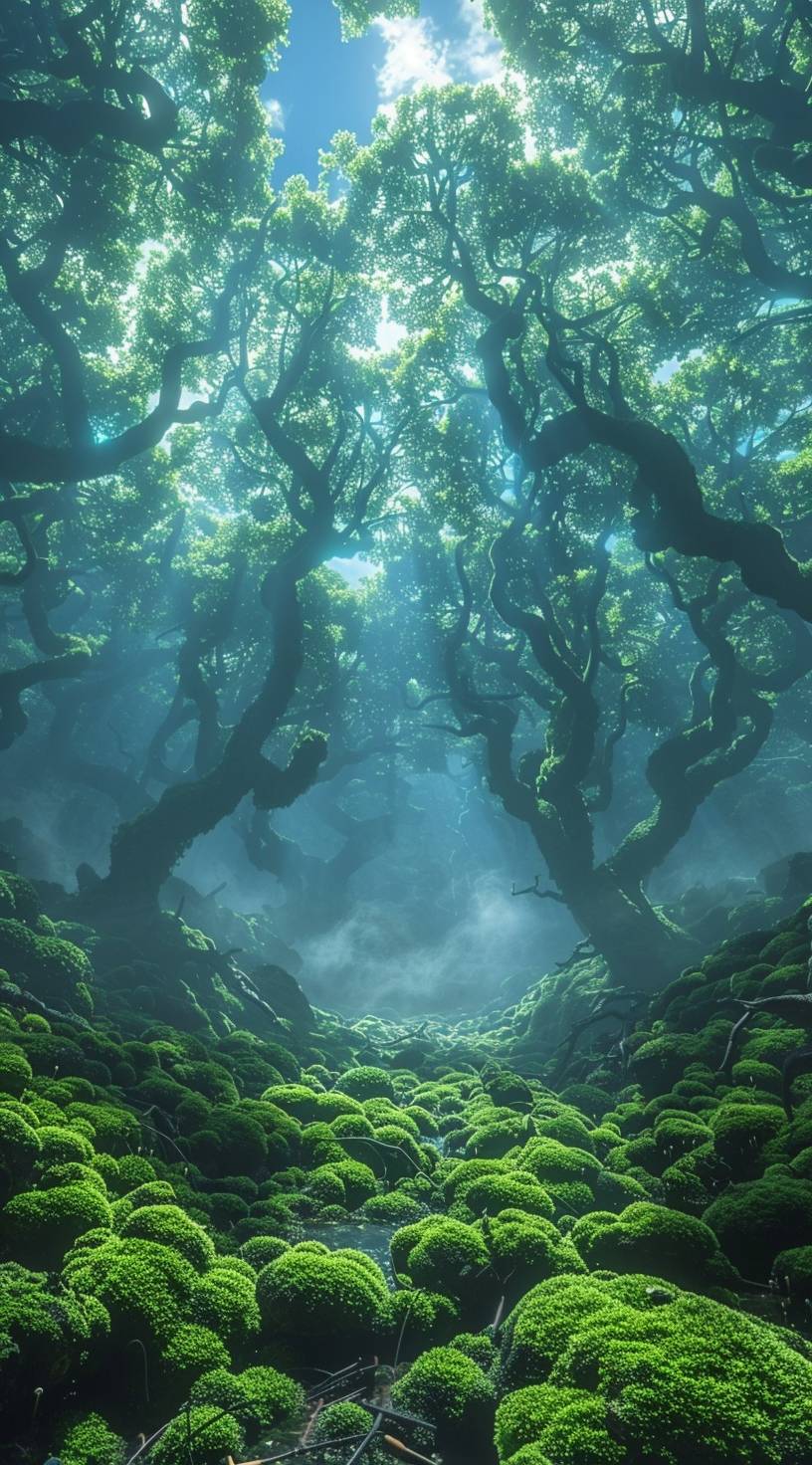 A mysterious space in a deep,humus,quiet forest with moss-covered fallen trees,bright style,adventure vibe,dust,mycelium and puddles,anime style,key visual,sky --chaos 10 --ar 5:9 --style raw --stylize 990 --v 6.0