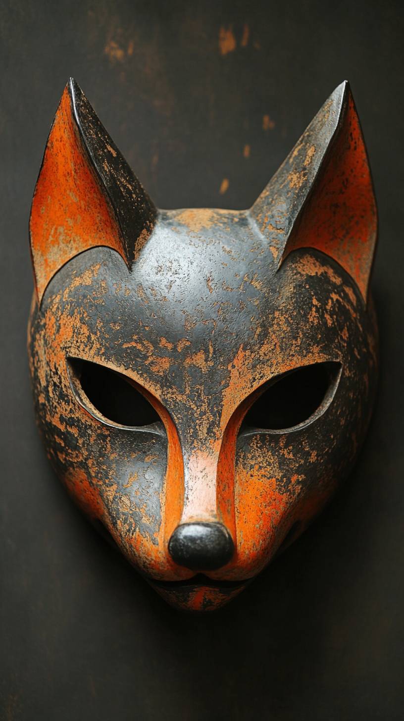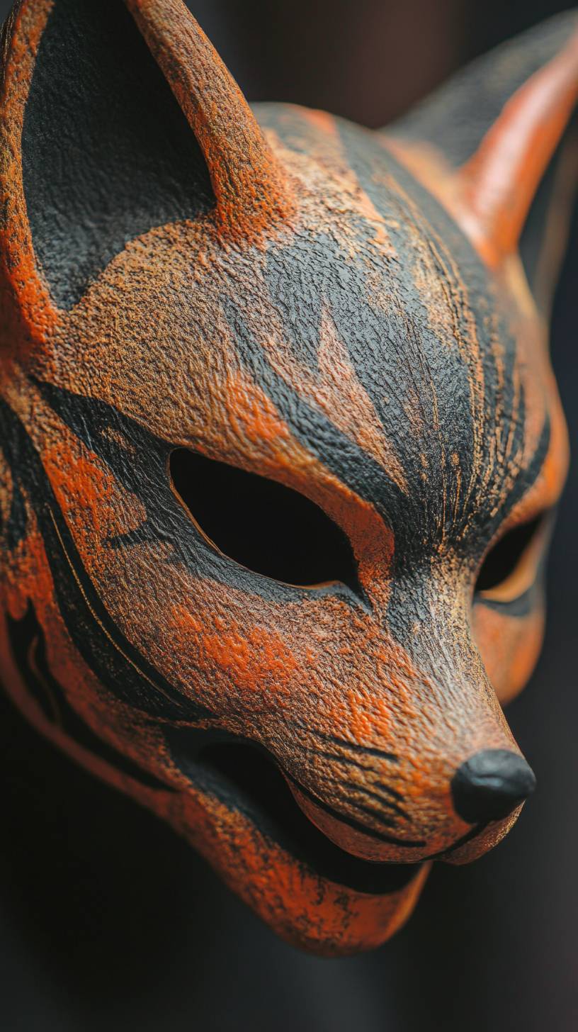 Masque de théâtre coréen traditionnel représentant un renard avec une texture rugueuse.