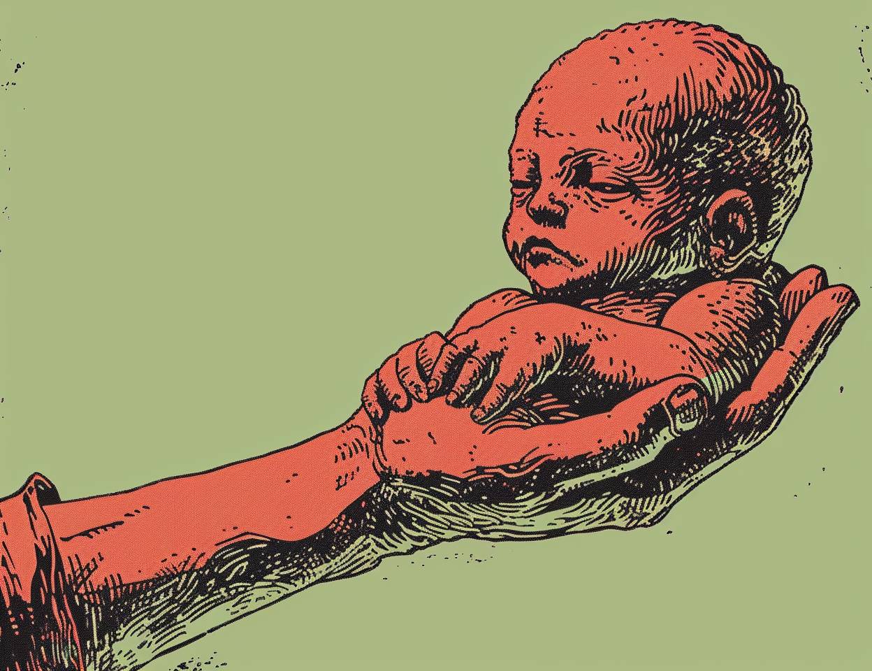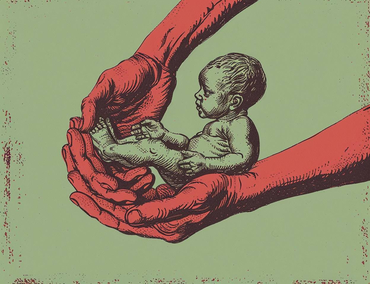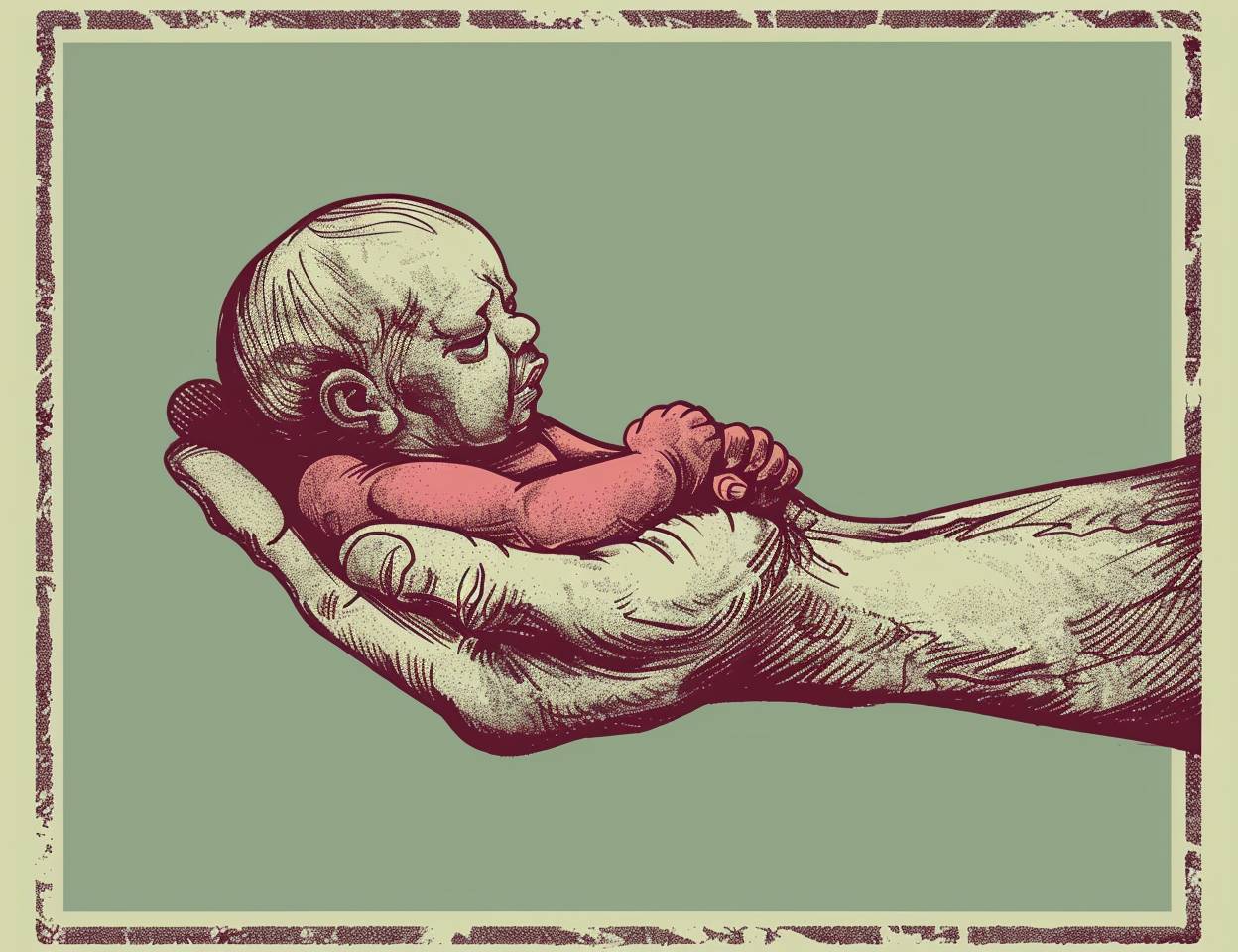 Un panneau de bande dessinée d'un bébé humain primitif dans une main, dessiné dans un style d'encre et de plume avec des couleurs rouges profondes sur un fond vert clair. Le personnage est représenté comme s'il était dessiné d'après nature, sans traits du visage ni proportions corporelles. C'est un gros plan qui se concentre uniquement sur un bras maintenant le petit garçon dans sa paume.