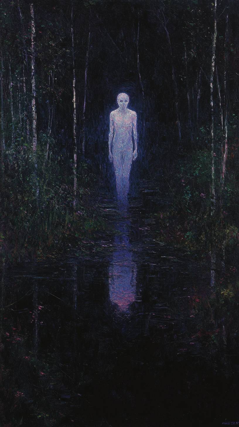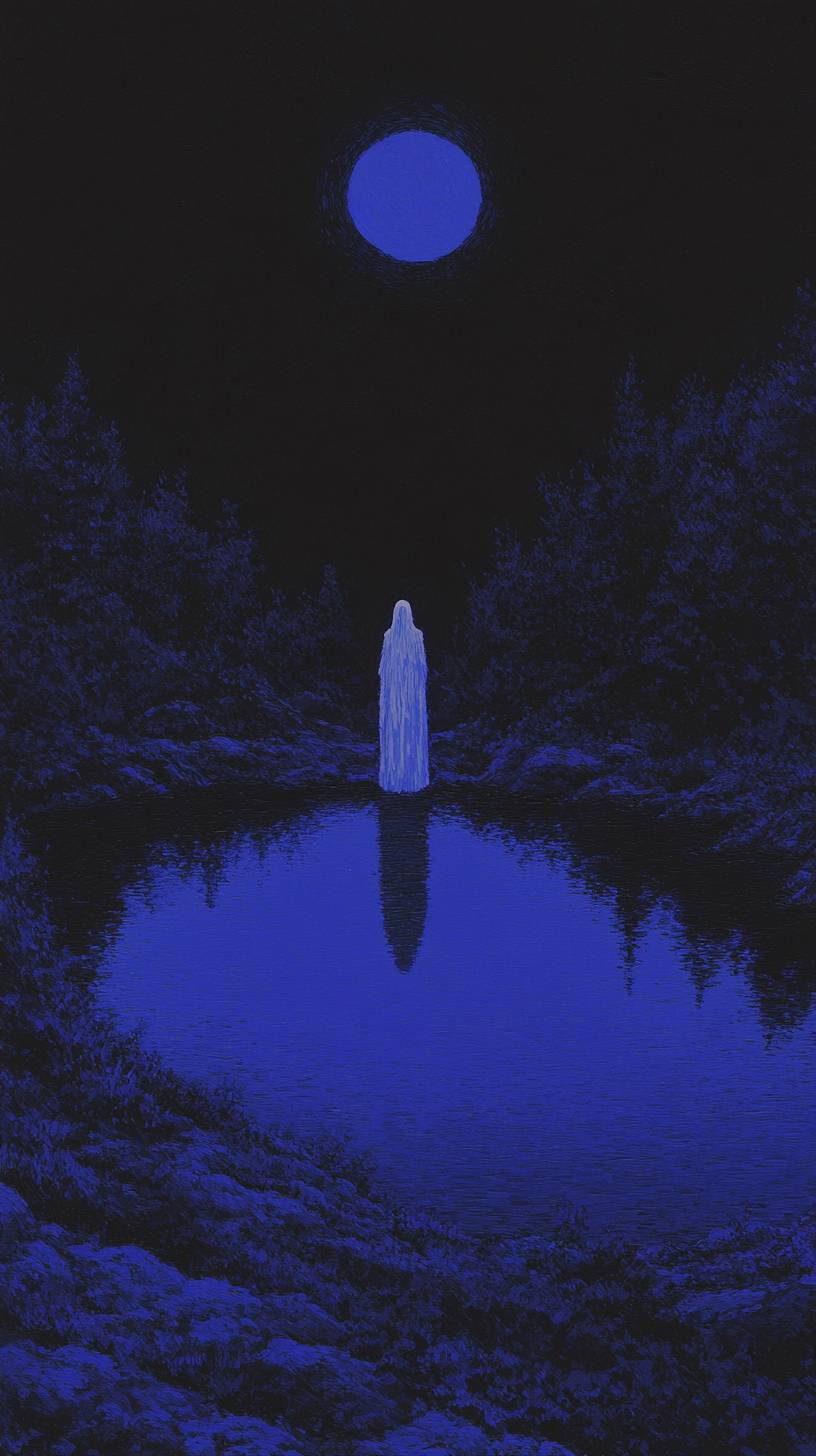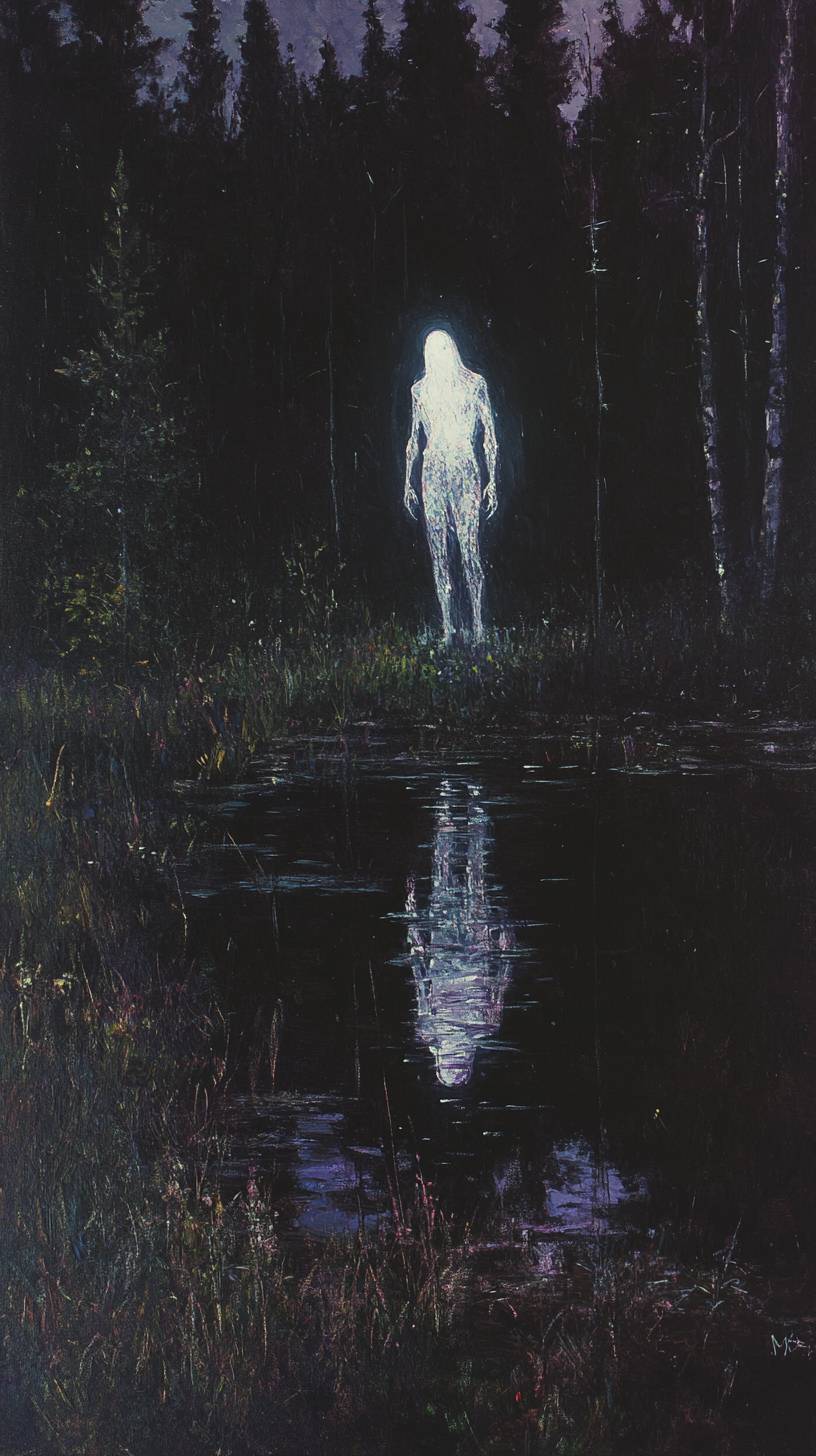 a dark forest with a lake in the middle, a glowing ghost of a woman standing by the lake. Hard shadows, comic book style, Frank Miller, acrylic on canvas, in the style of large-scale paintings, bold block prints, sublime wilderness, illustration, bold color field, realistic oil painting --ar 9:16 --personalize hvpi2ug --stylize 750 --v 6.1