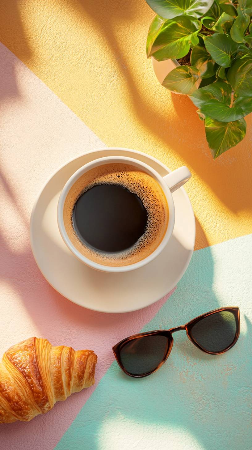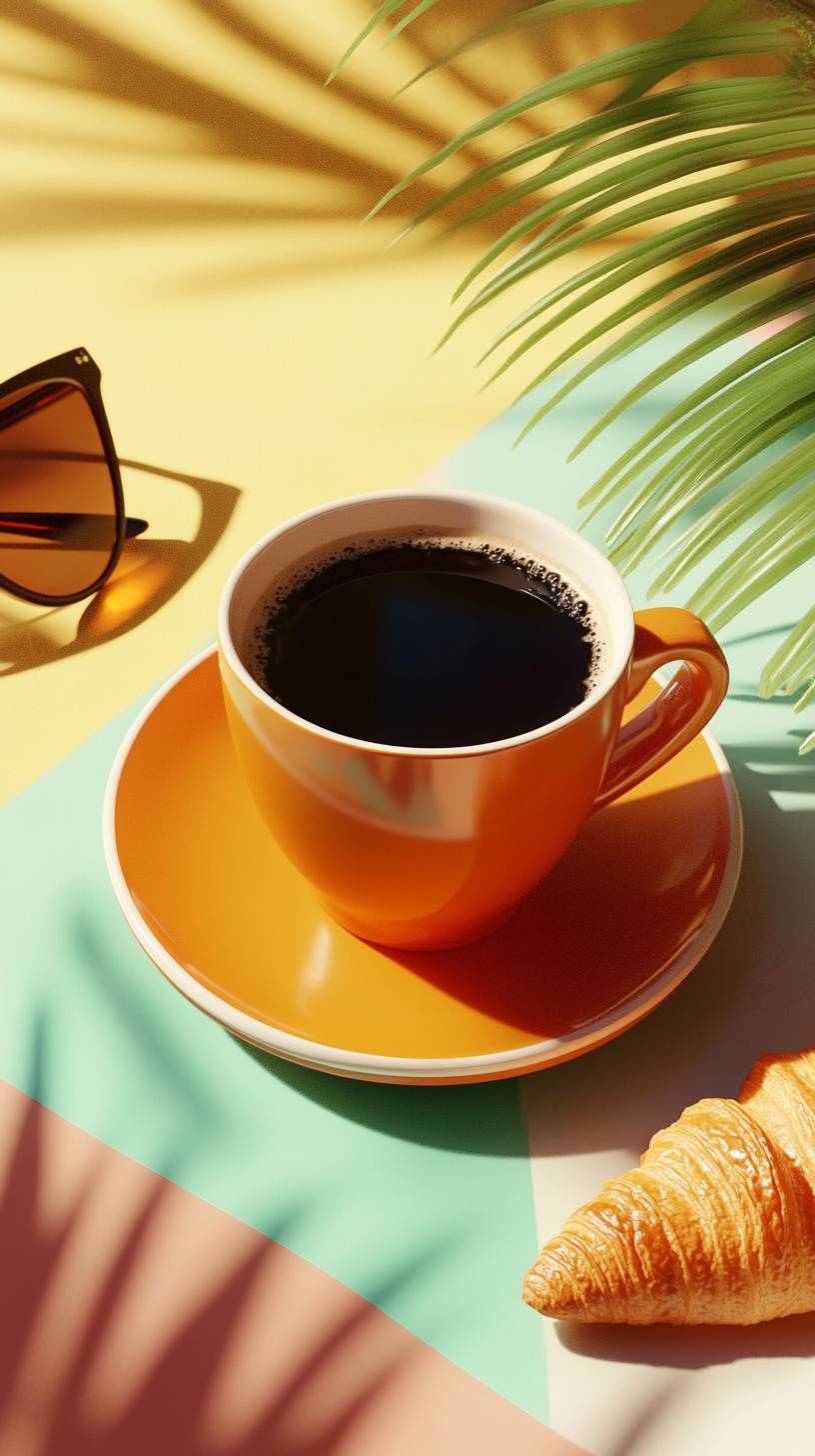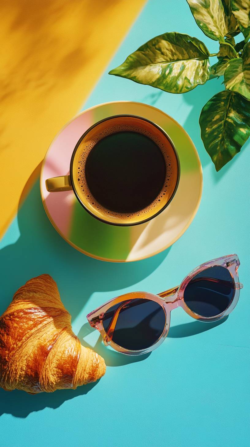extreme close-up of a color cup of black coffee over a colorful table, in the table we see a piece of croissant a little plant and chic sunglasses, in the style of top view, in the style of complementary colors palette, natural shadowing light, hyper-realistic, high quality, cinematic, hyperdetail, UHD, --ar 9:16 --v 6.1