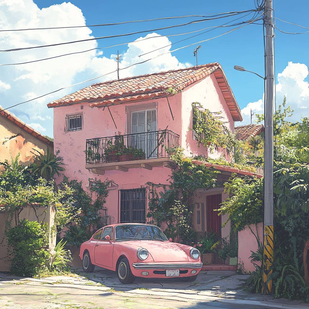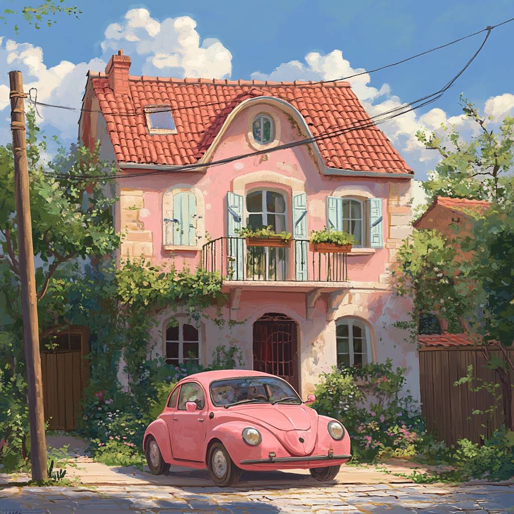 Une scène vintage charmante mettant en vedette une voiture rose garée devant une maison française à deux étages. La maison est peinte dans une teinte de rose similaire, avec un toit en tuiles rouges et un petit balcon, lui donnant un aspect pittoresque et nostalgique. Une végétation luxuriante entoure la maison, avec des plantes et des arbres projetant des ombres sur les murs, ajoutant à l'atmosphère sereine. Le ciel est d'un bleu clair avec des nuages blancs duveteux, renforçant l'environnement paisible et idyllique. Les lignes électriques et le poteau de service au premier plan ajoutent une touche urbaine, contrastant avec les éléments naturels. La composition globale suggère un mélange harmonieux de nature et d'habitat humain, évoquant un sentiment de tranquillité et d'intemporalité.