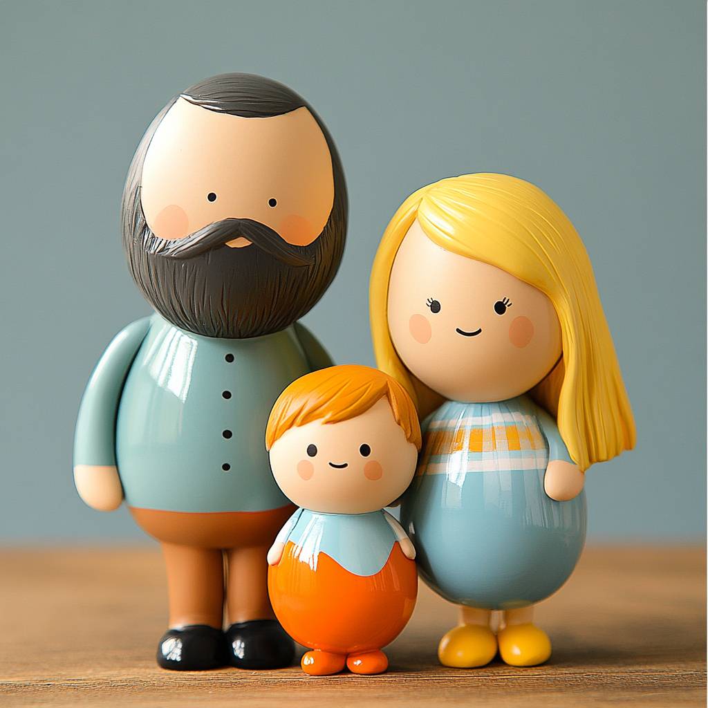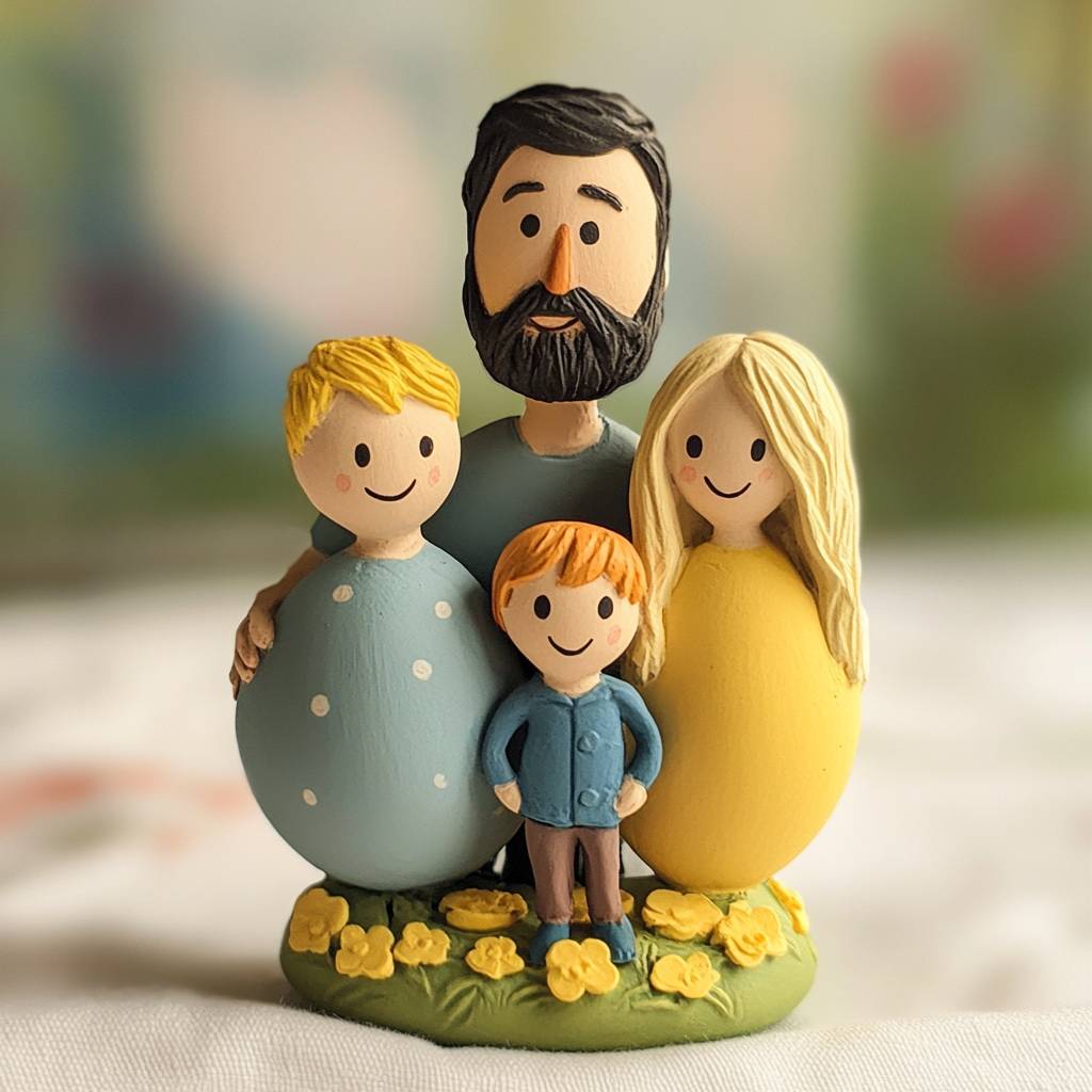 De charmantes figurines d'œufs de Pâques représentant une famille composée d'un homme à la courte barbe noire, de sa femme blonde aux cheveux longs et de leur fils de 10 ans.