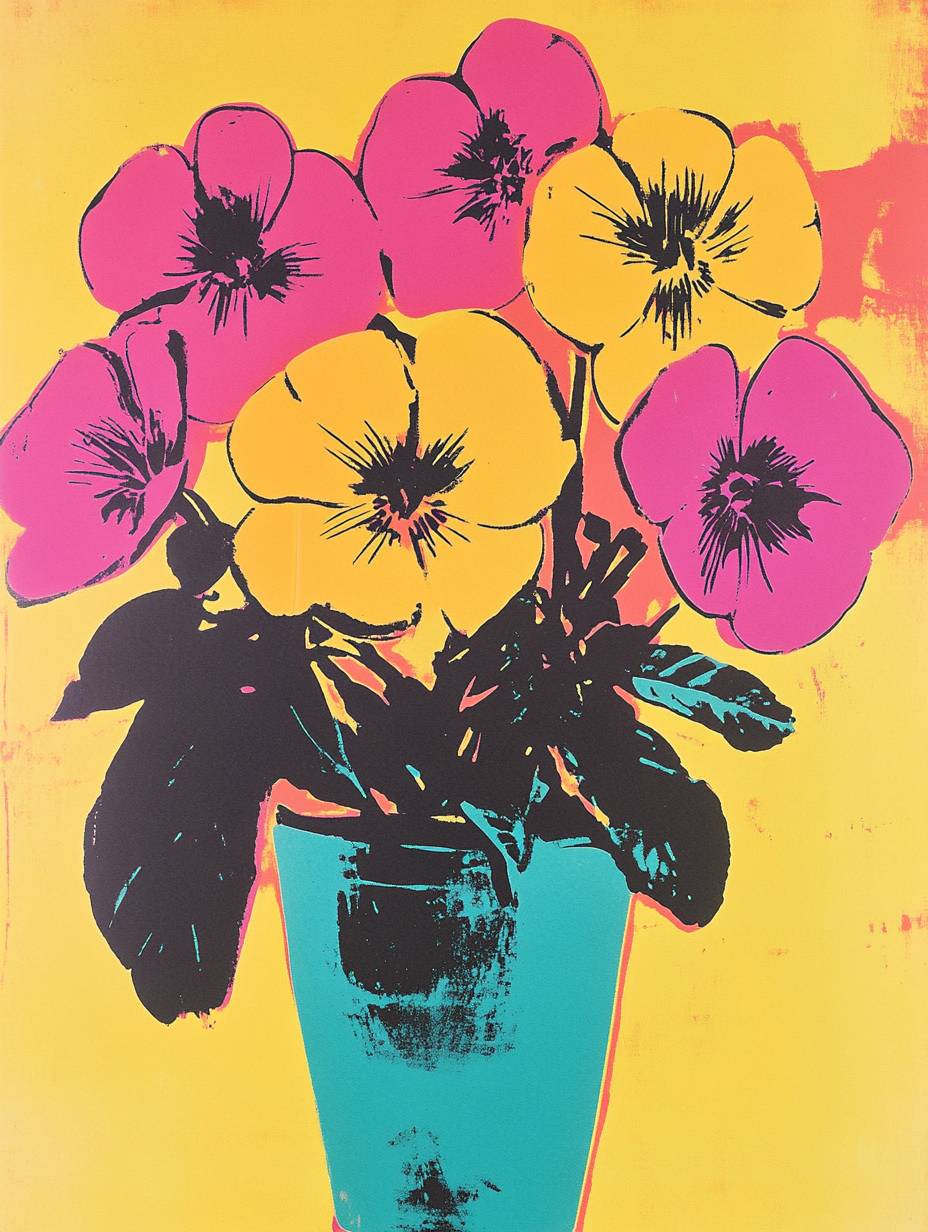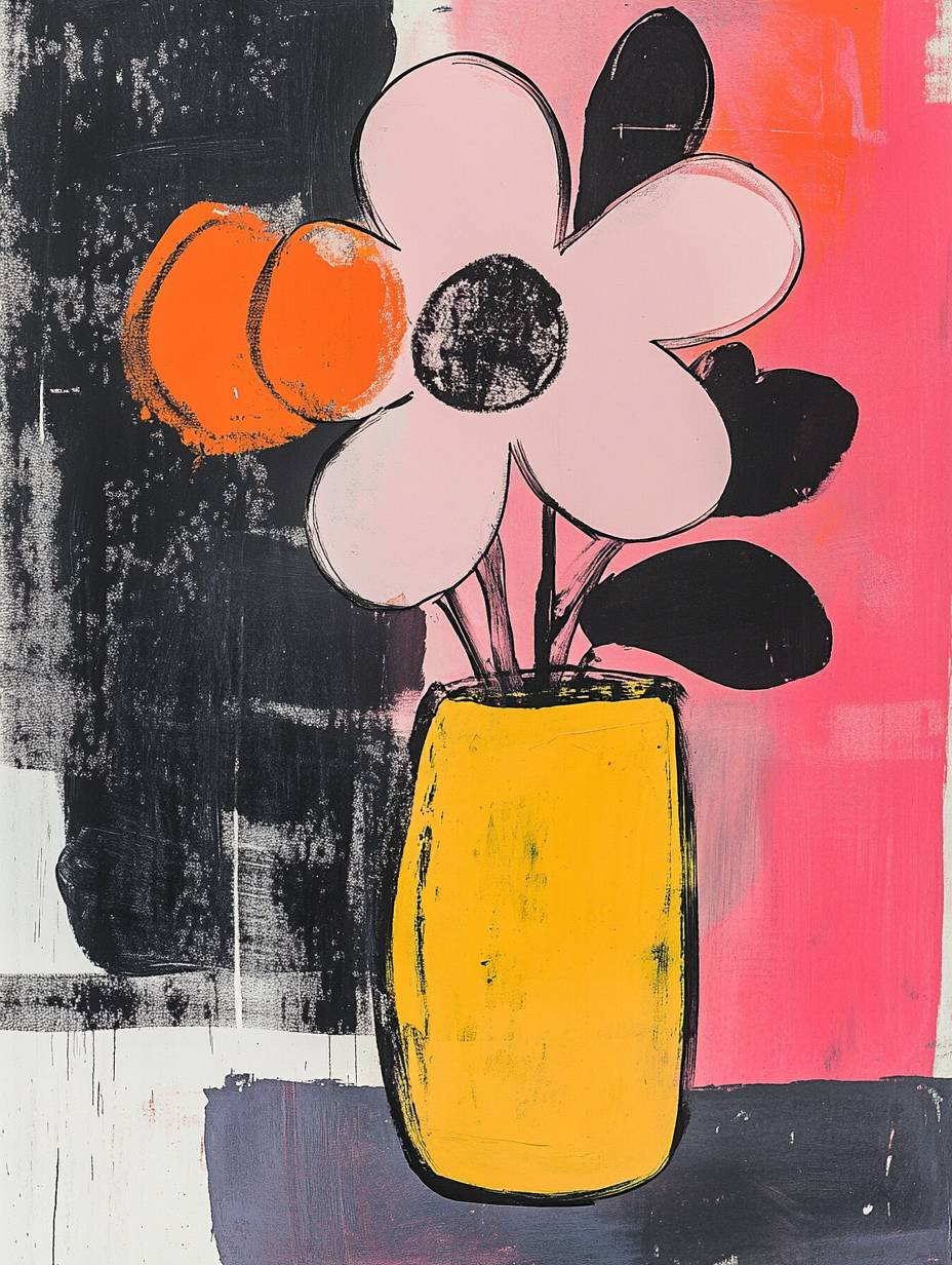Une peinture unique et expressive d'une fleur dans un vase par Haring et Warhol, style graphique moderne, romantique, style Marimekko, rétro, unique et rare, chef-d'œuvre