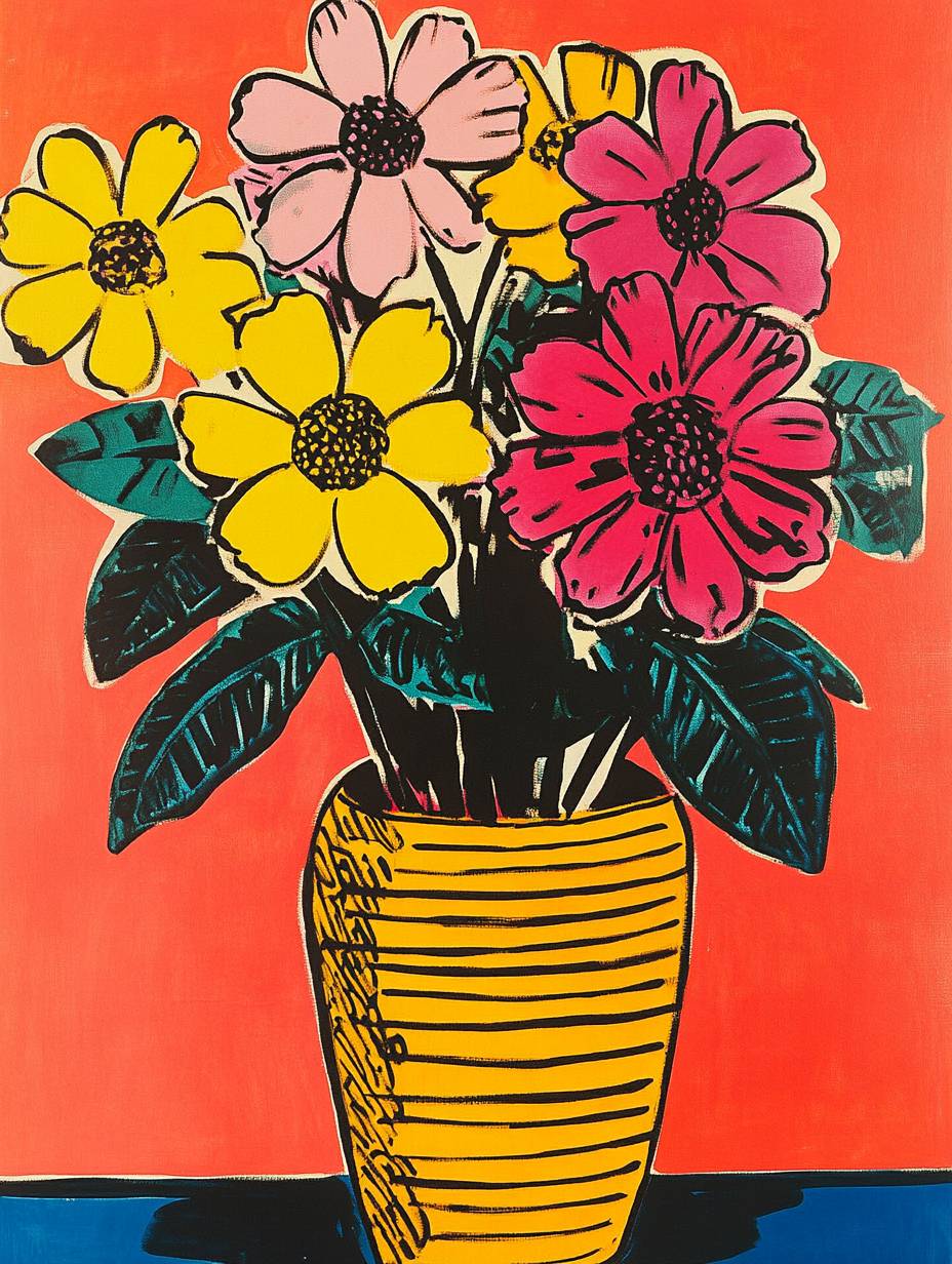 a unique expressive flower in a vase painting by haring and warhol, modern graphic style, romantic, marimekko style, retro, unique and rare, masterpiece, --ar 3:4 --v 6.1