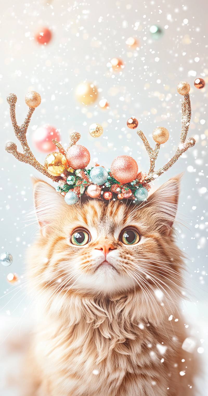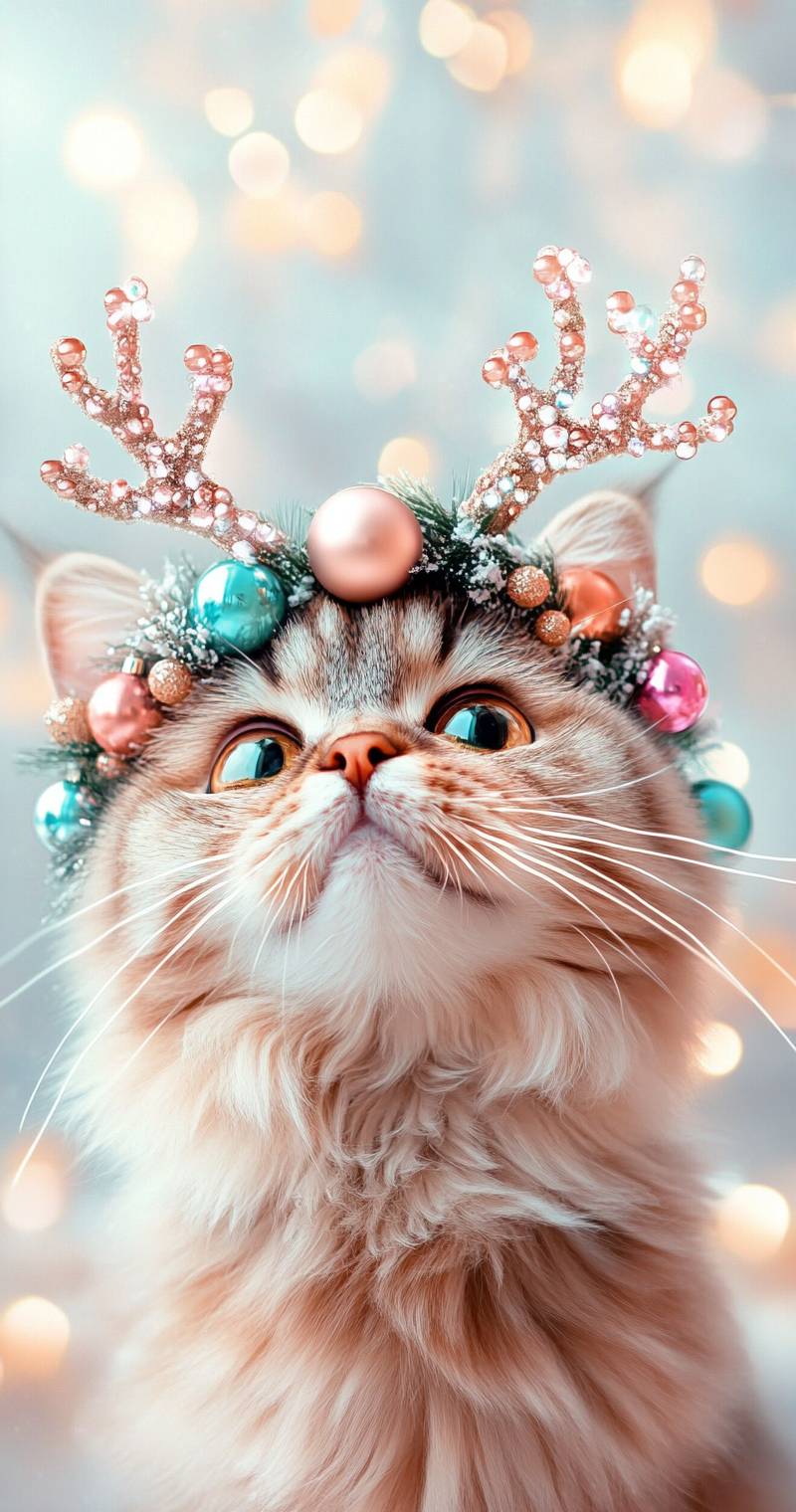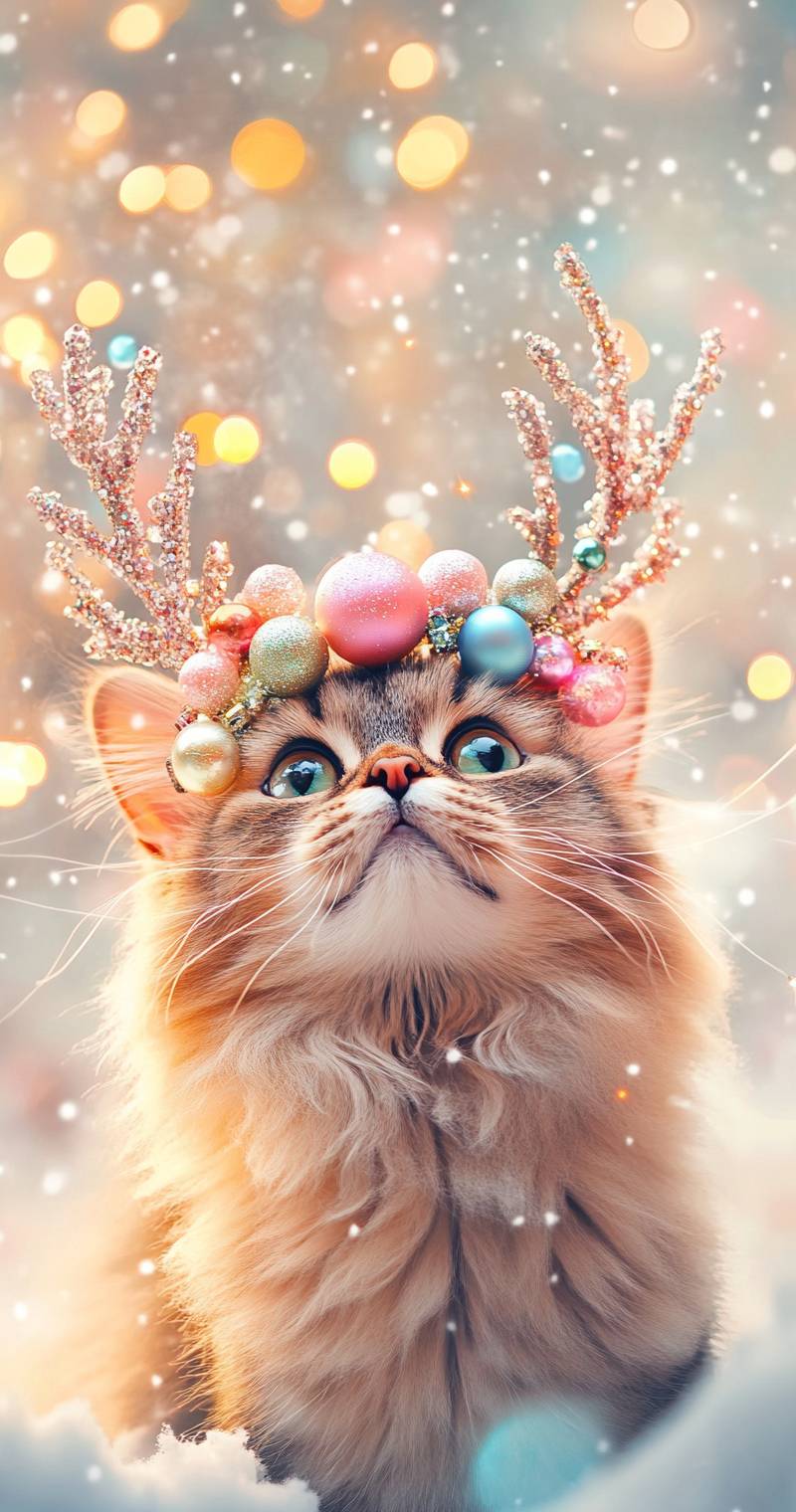 A cat with the antlers of a Christmas reindeer with large antlers, wearing a wreath of Christmas balls and jewels, standing in a snowy forest, realistic photography --ar 9:17 --style raw --personalize 857x5oj --stylize 250 --v 6.1
