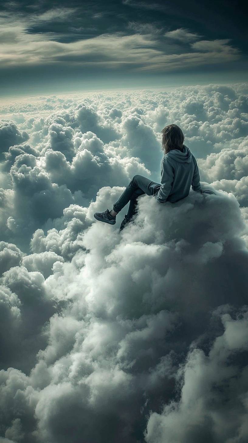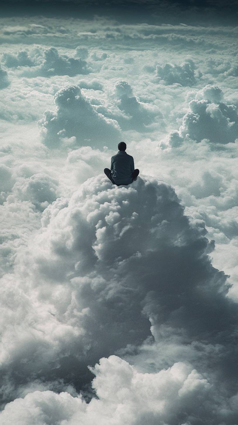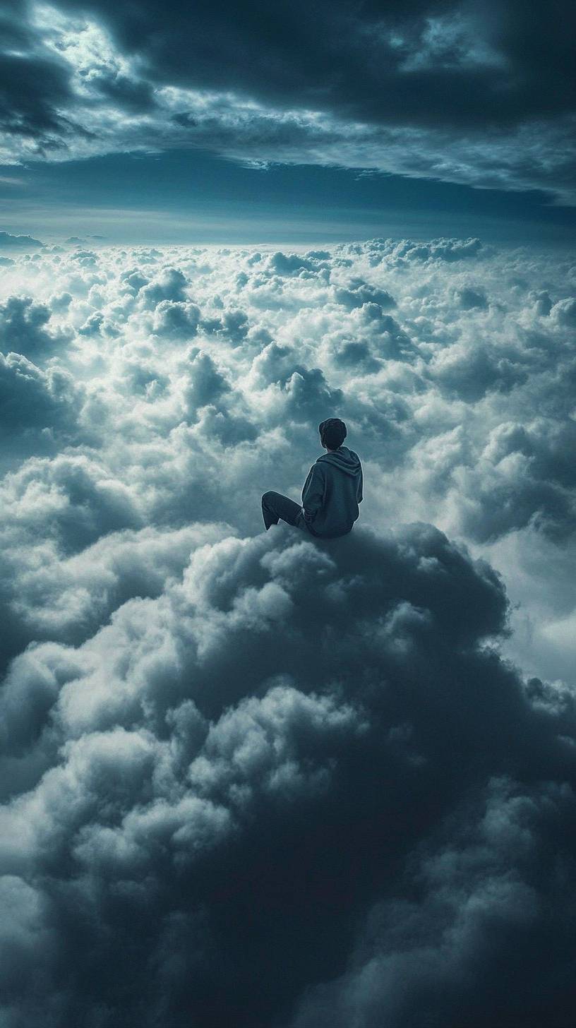 A person sitting on top of the clouds, surrounded by gray clouds and a dark blue sky. This surreal image combines elements of photography and surrealism, creating a long-shot scene. --ar 9:16 --v 6.1