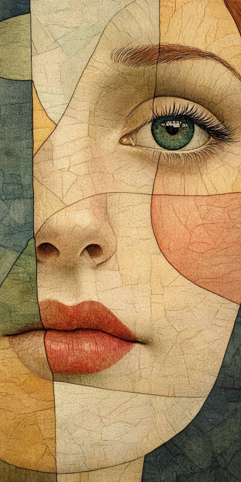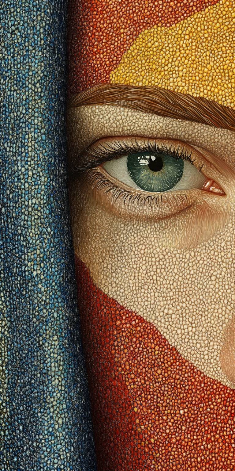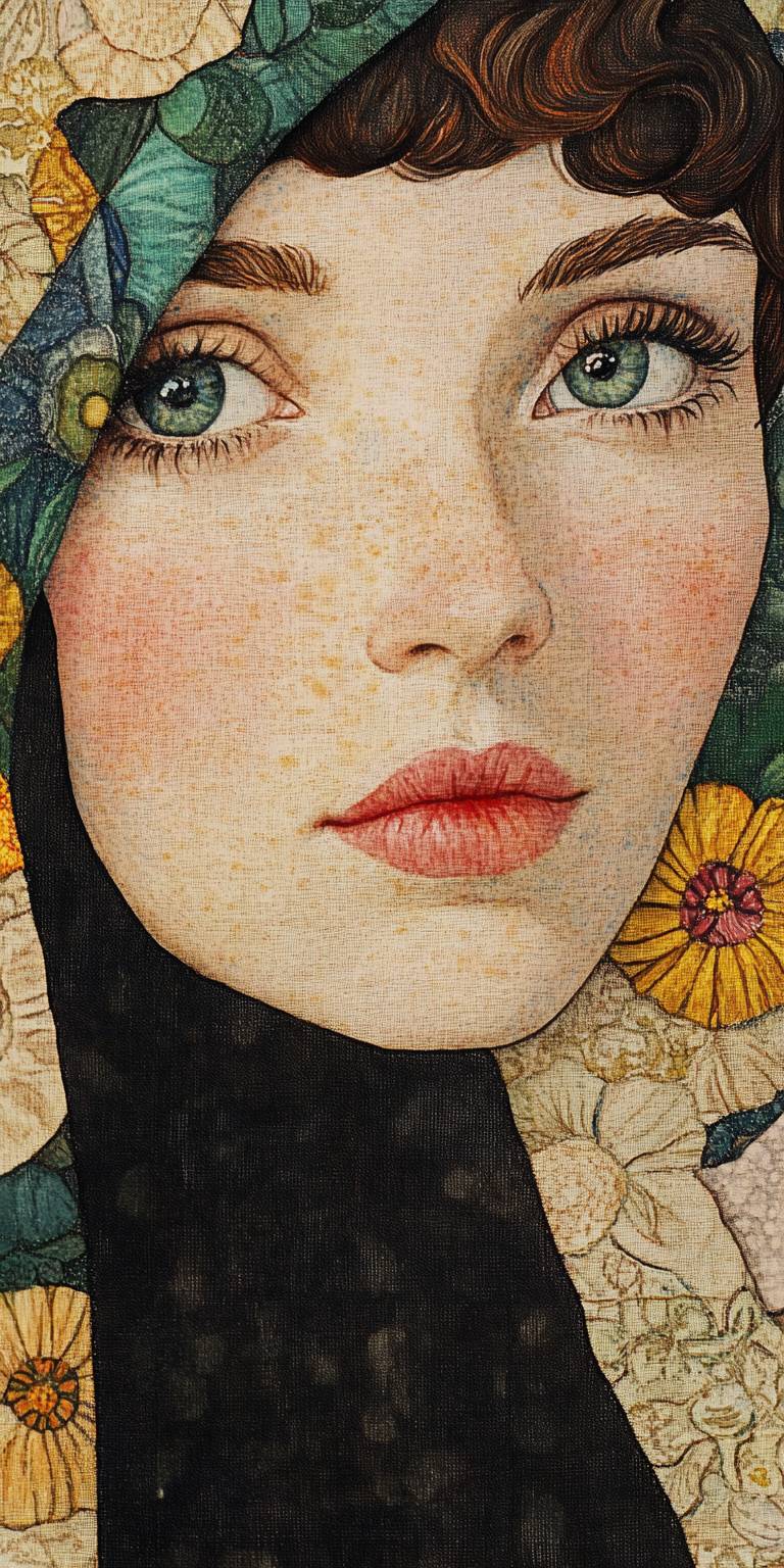 Le pointillisme pastoral prismatique en aquarelle superpose l'arrière-plan et le visage d'un modèle art déco, avec des couleurs riches et des yeux brillants.