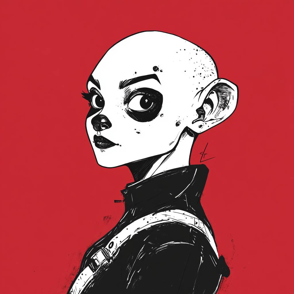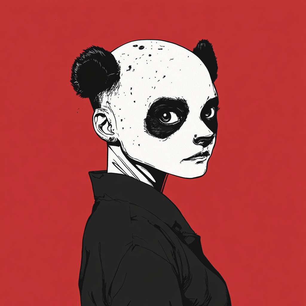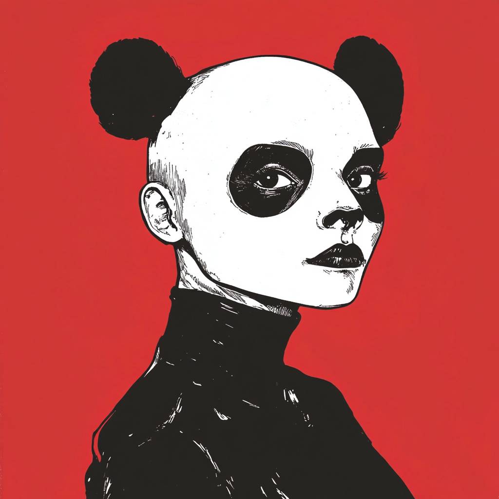 Un dessin en ligne de style cartoon d'une femme. Sa tête est celle d'un panda. Elle regarde la caméra. Sa tête est rasée, sans cheveux. Son visage a du maquillage de panda et elle a des oreilles de panda. Style vintage en noir et blanc, comme un cartoon Marvel des années 50. L'arrière-plan est rouge.