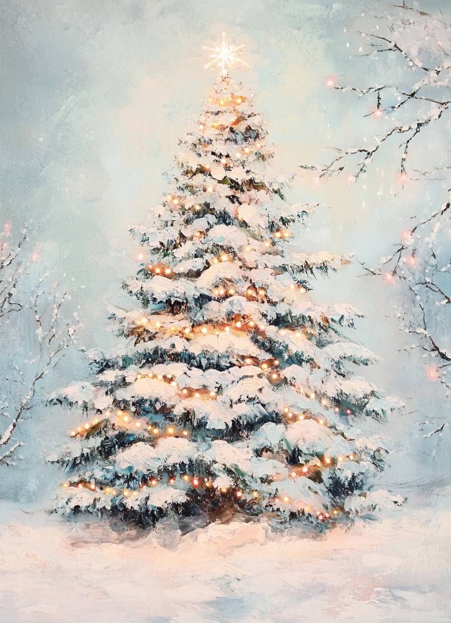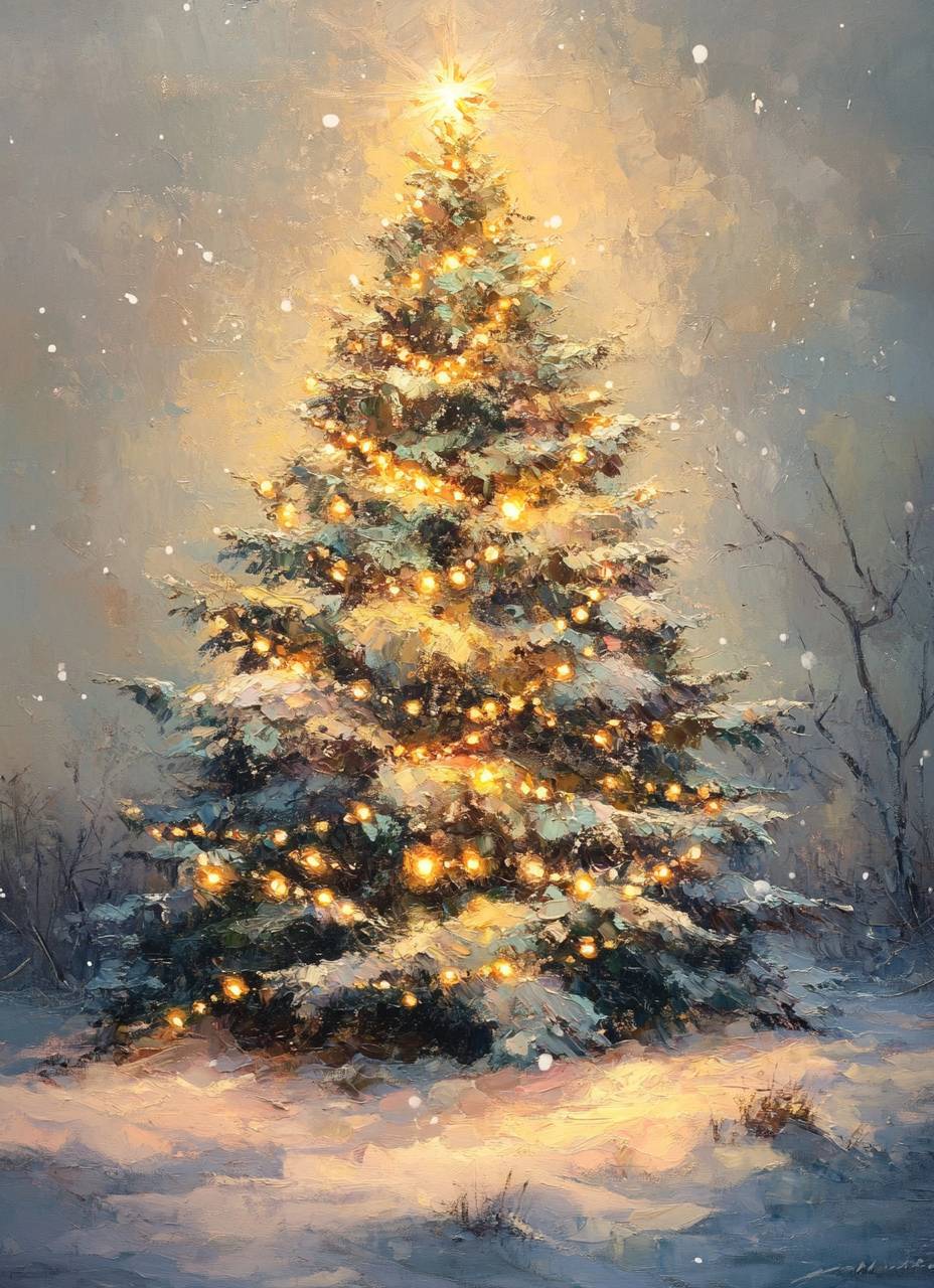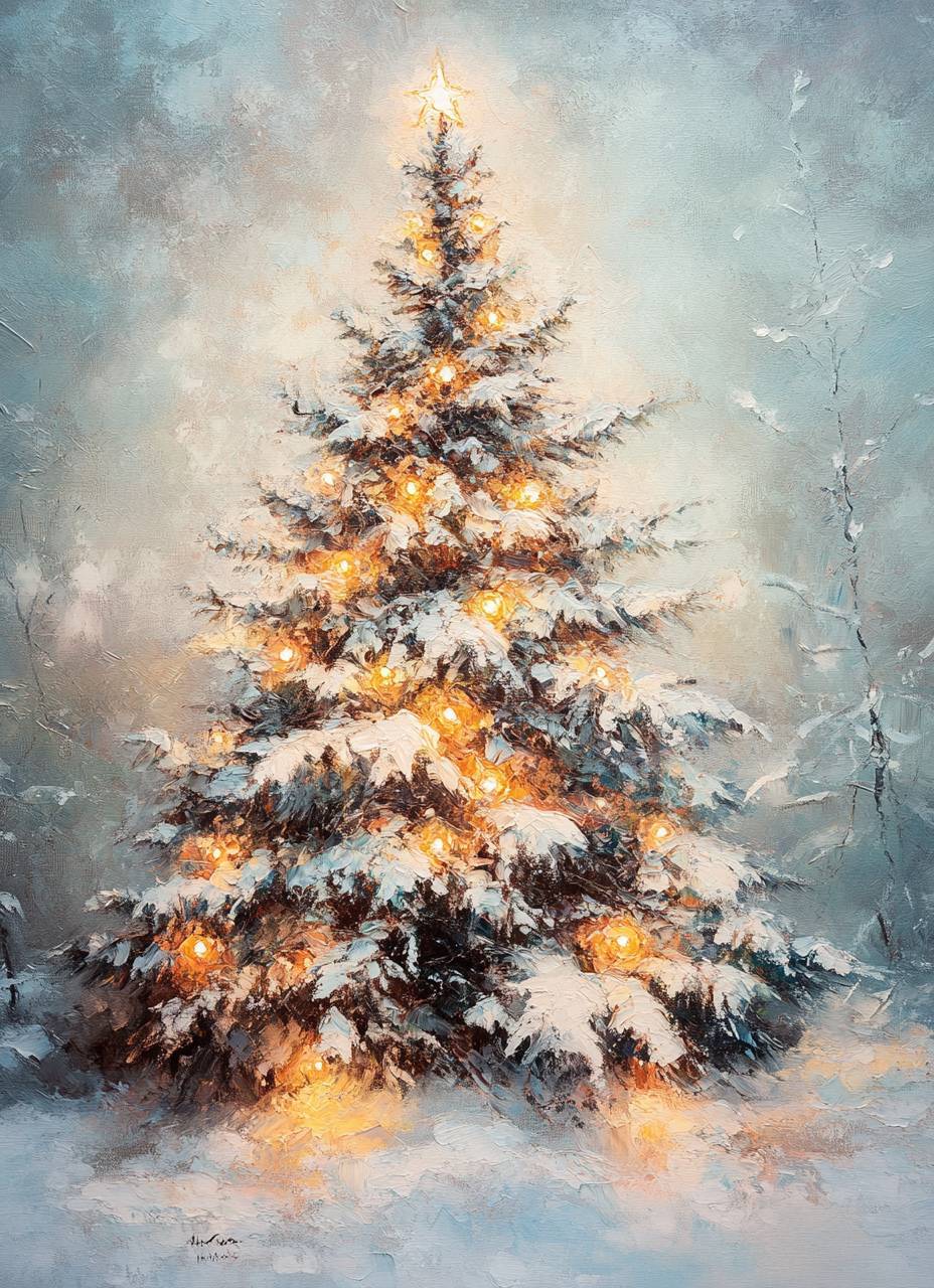 Un arbre de Noël décoré de lumières, contre un fond enneigé avec des tons neutres doux, mettant en valeur une peinture à l'huile vintage sur toile.