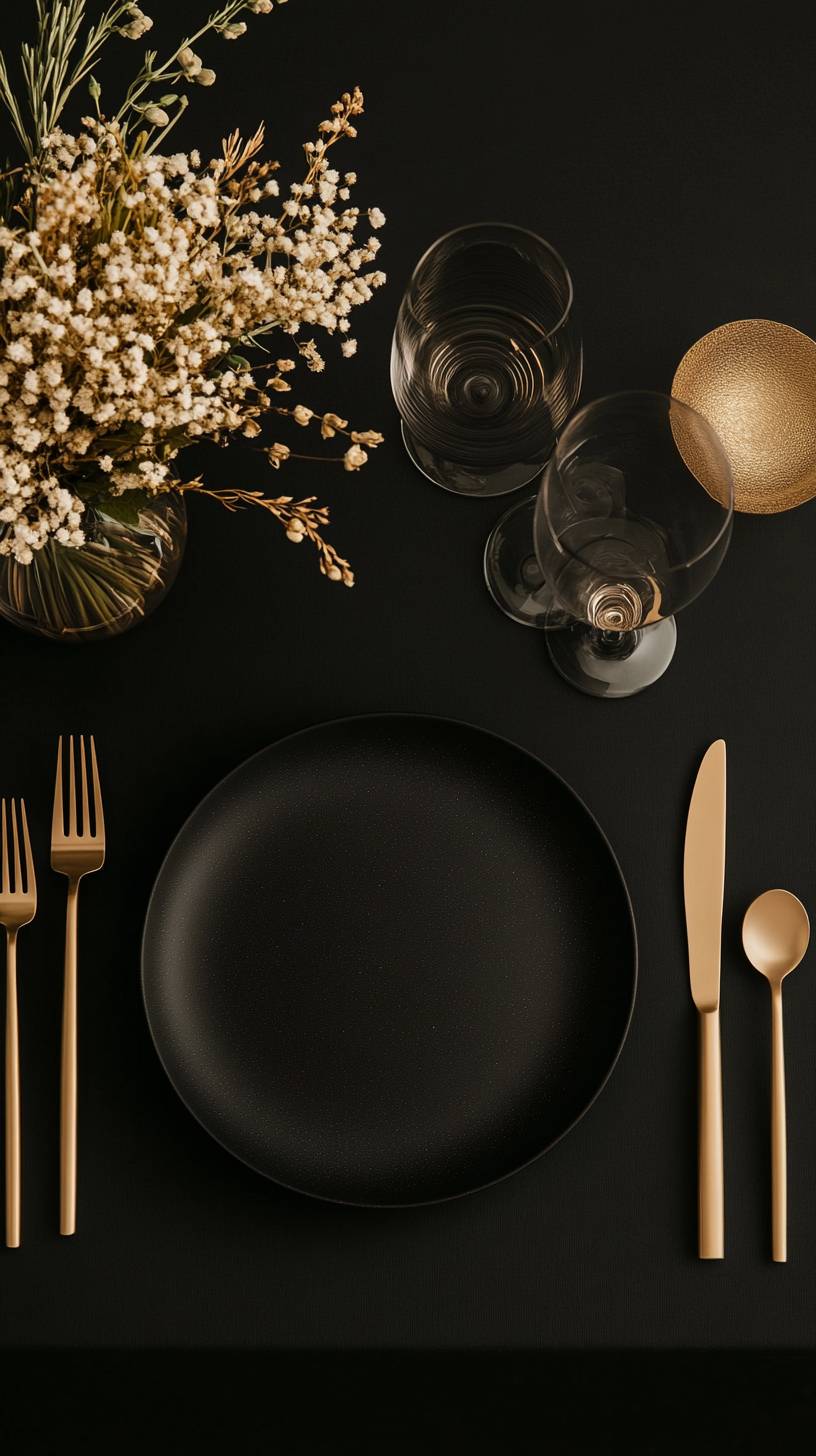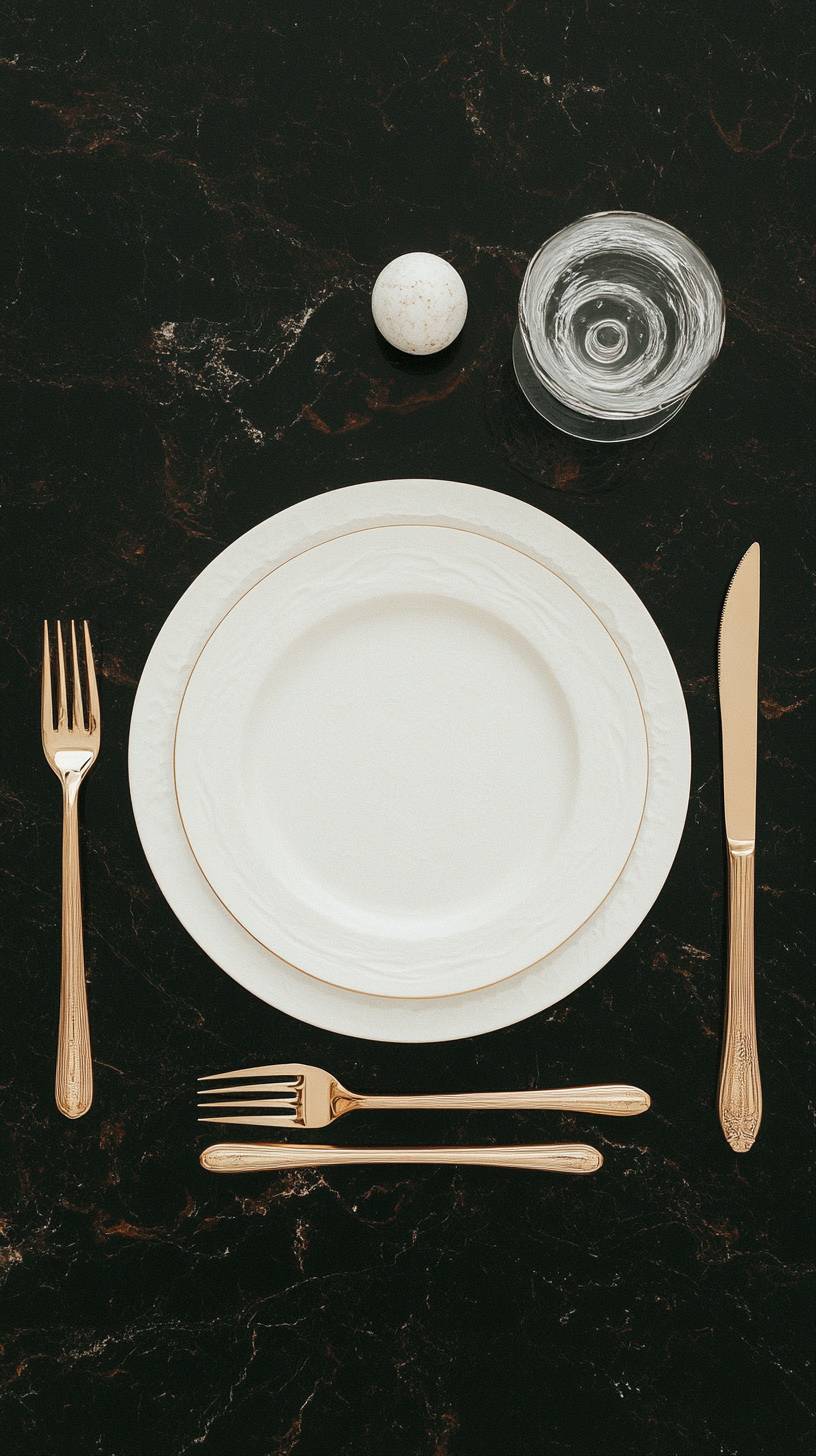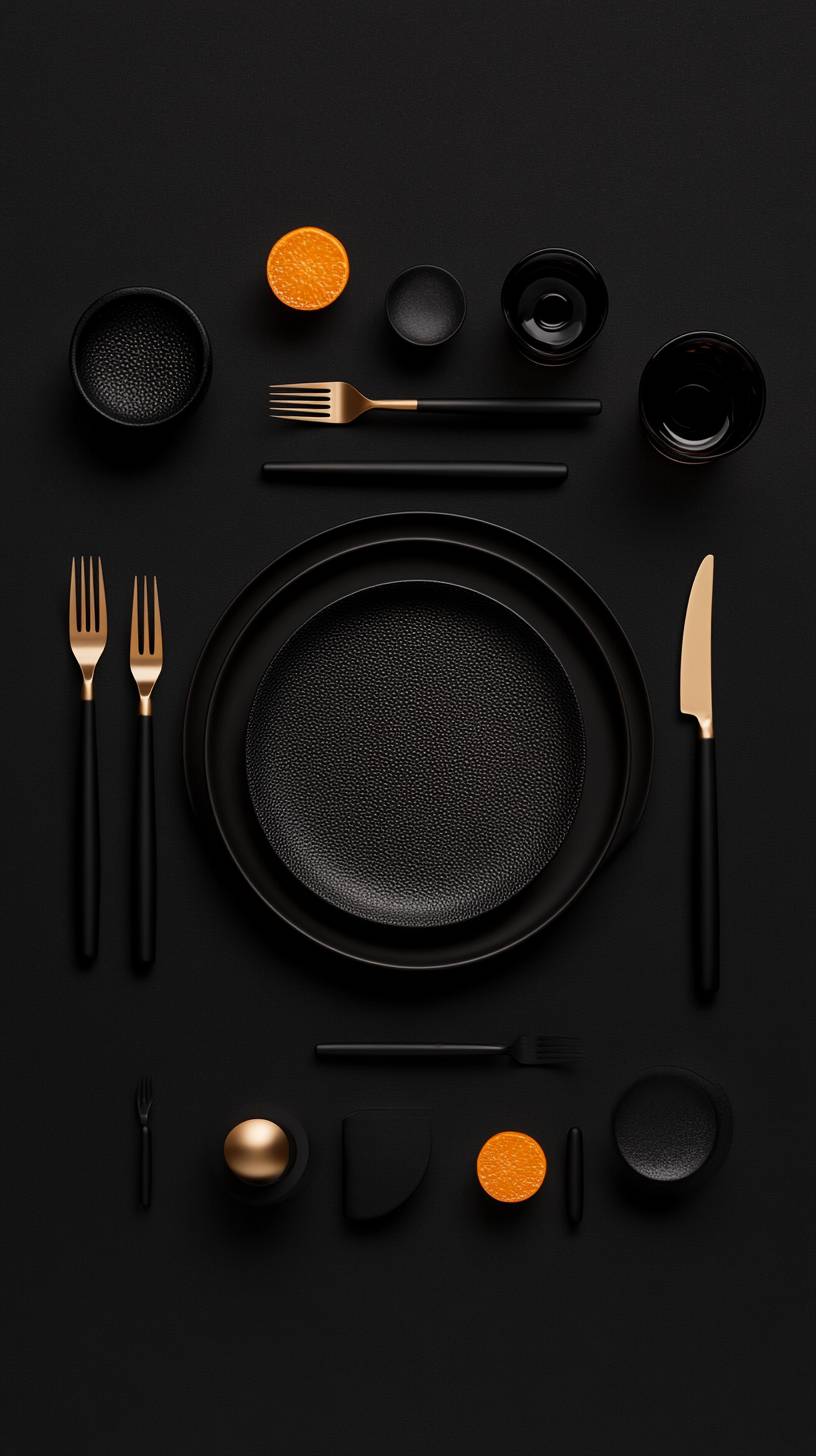 Tablewear viewed from above, an ensemble featuring a plate flanked by a knife and a fork, the layout is influenced by biomorphism, ascii rorschach, modern geometric art, and futuristic details, in the style of the avant-garde fashion movement, resonating with the audacity of Daphne Guinness, art in the style of Iris Van Herpen and Gareth Pugh, made by different textures from smoked glass. Featuring dramatic lighting --ar 9:16 --style raw --personalize rxf46ez --stylize 450 --v 6.1